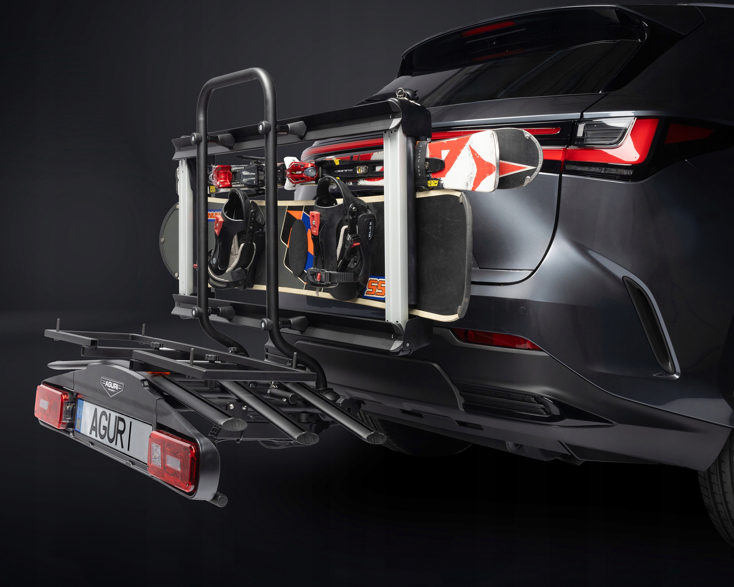 - Власник лижників -має робочу ширину 400 мм , що забезпечує стабільне та безпечне кріплення до 3 пари лиж або 2 сноуборду. Встановлення ручок на платформі та для кріплення коробки (коробка/платформа Aguri не включається)