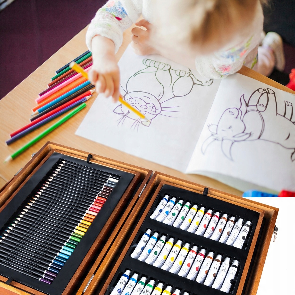 ⚡Набір містить широкий вибір фарб, включаючи акрилові, олійні, водні та акварельні фарби. Ви можете експериментувати з різними техніками малювання