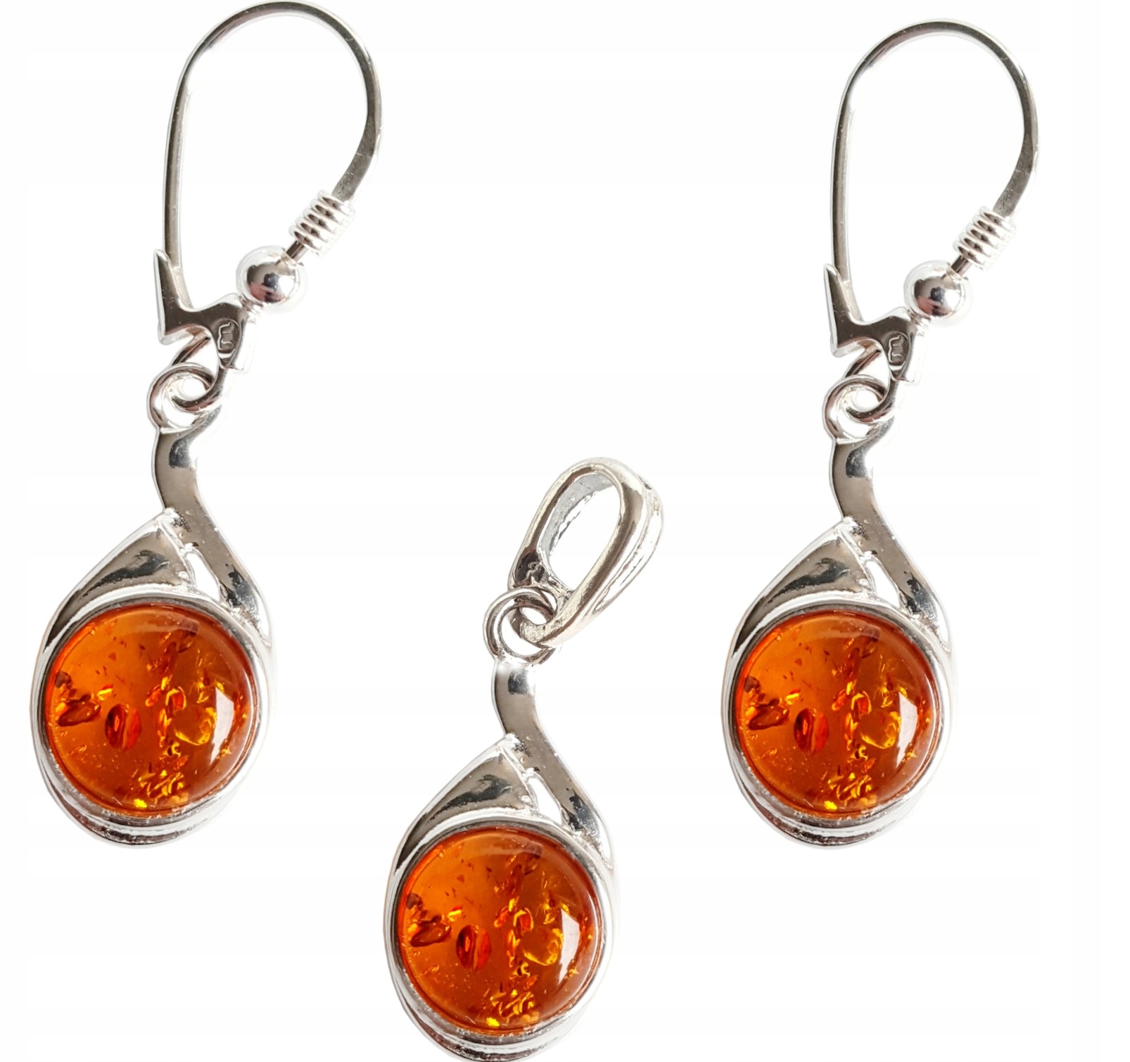 Пропонований КОМПЛЕКТ із срібних сережок і бурштинової підвіски є повністю новим і походить від місцевих ювелірів-митців із Гданська та околиць, які займаються дизайном бурштину на щодня. Очки в сережках виготовлені зі справжнього бурштину.