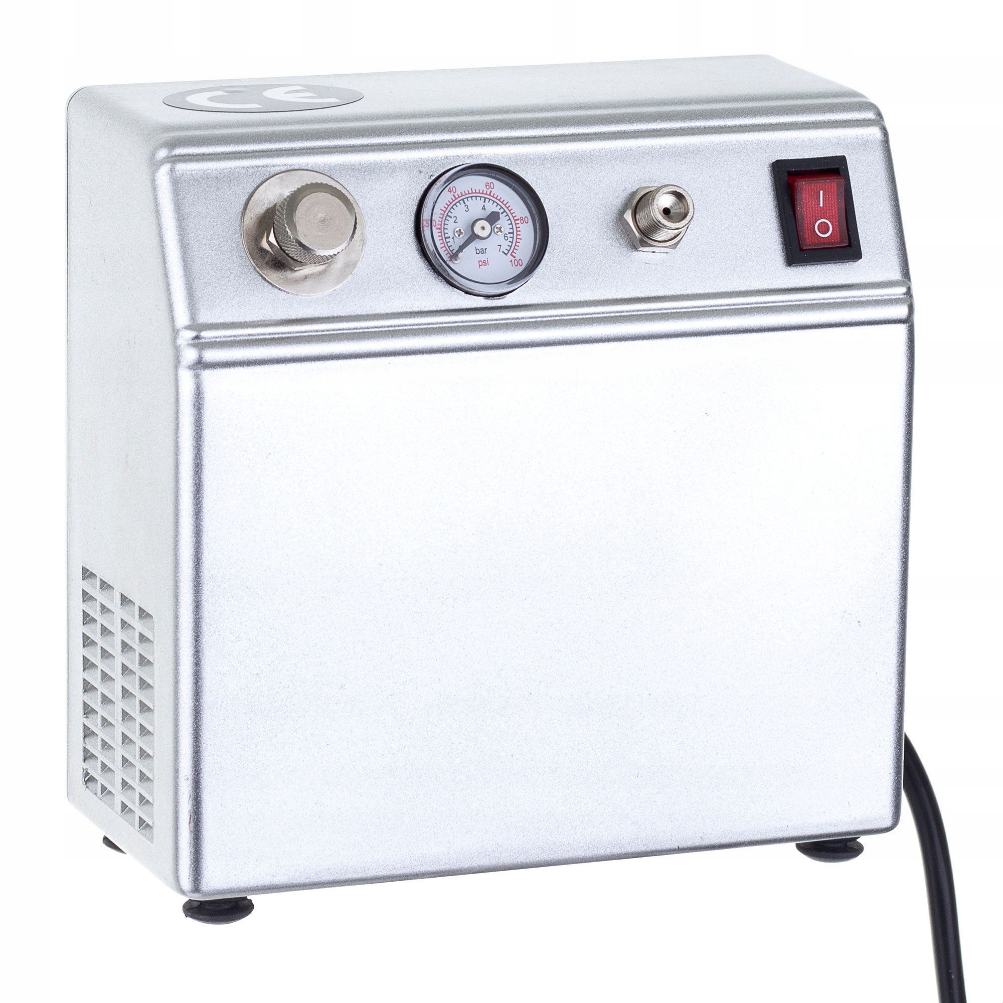 Простий, міцний і ефективний компресор для аерографа. Оснащений редуктором і манометром, які дозволяють контролювати робочий тиск.