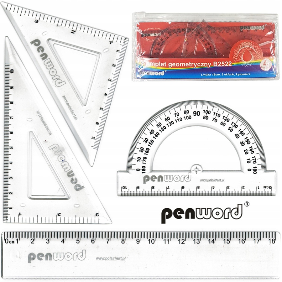 У набір входять: лінійка 18 см, косинець під кутом 60 градусів, косинець під кутом 45 градусів і транспортир на 180 градусів.