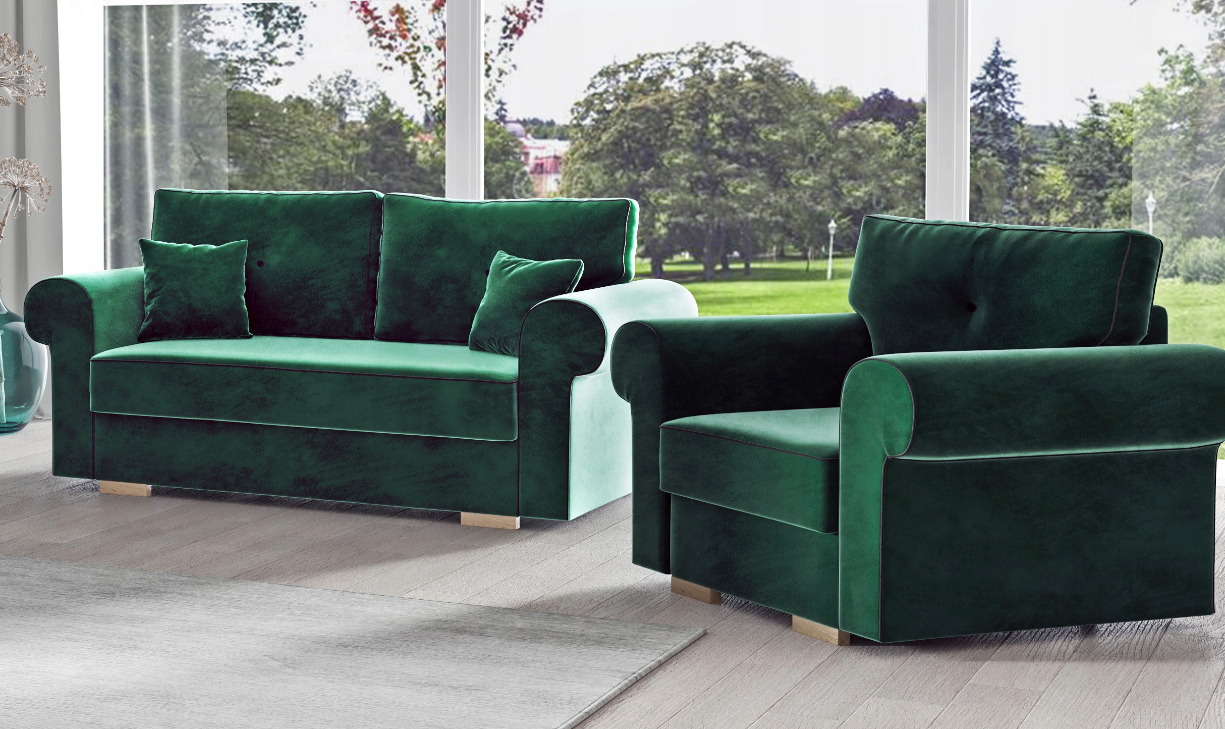 Всі елементи комплекту виготовлені з високоякісних оббивних матеріалів. Всі елементи повністю виготовлені в Польщі! Набір надзвичайно практичний і функціональний. Тримісний диван має функцію сну. Набір універсальний і підійде як в сучасний, так і в класичний інтер'єр.