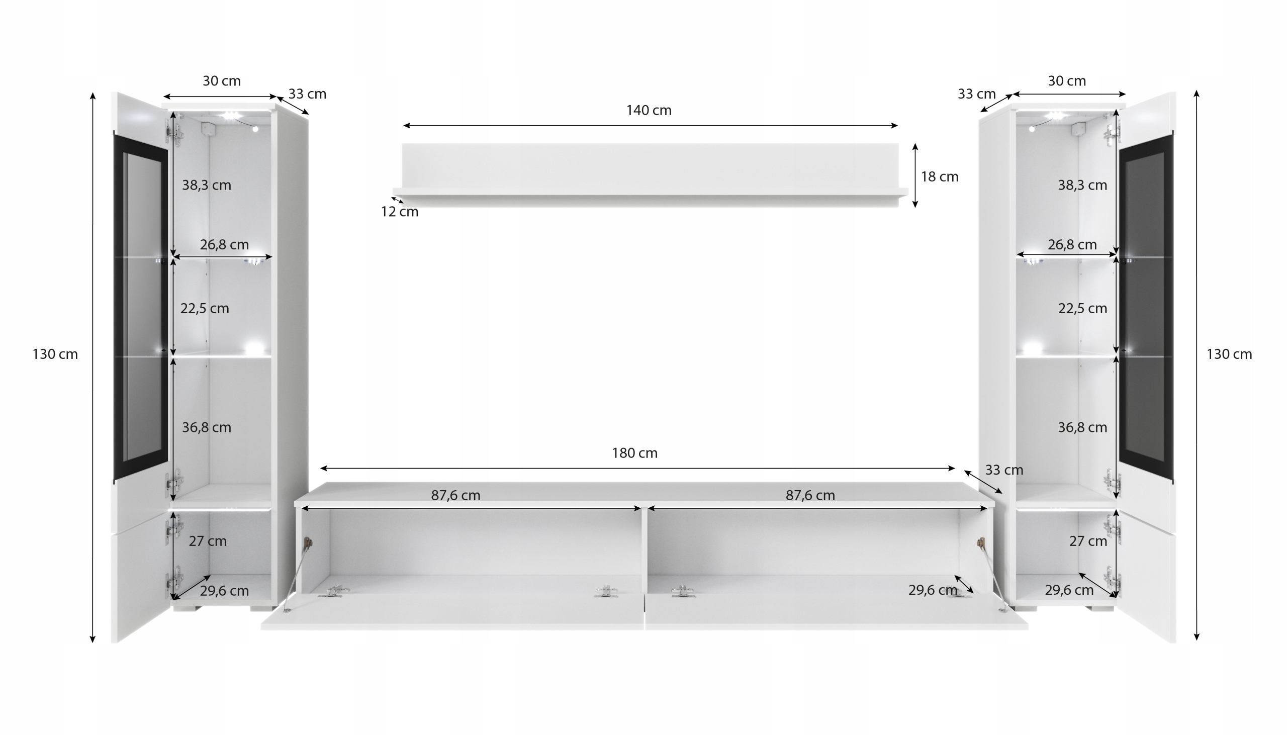 Меблі від польського виробника, дбайливо виготовлені з матеріалів найвищої якості. Весь виготовлений з ламінованої плити товщиною 16 мм. Фасади з поліглянцевої плити 15 мм. Краї покриті стійкою до стирання кромкою ABS (задні кромки - паперовою). Загартоване скло у вітрині.