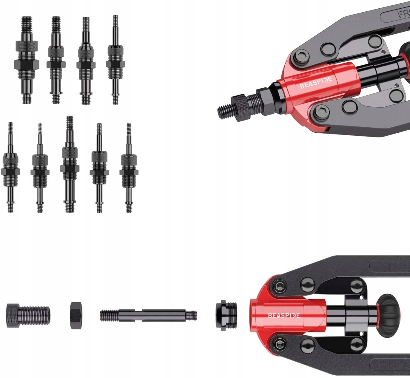 - Набір інструментів Beaspire постачається з 9 змінними штифтами (зокрема M4, M5, M6, M8, M10, M12, 10-24, 1/4- 20, 5/16 -18). Цю серію шипів можна комбінувати з заклепковою гайкою Beaspire 2-in-1 і підходить для 9 типів універсальних заклепувальних гайок на ринку для перемикання між різними завданнями.