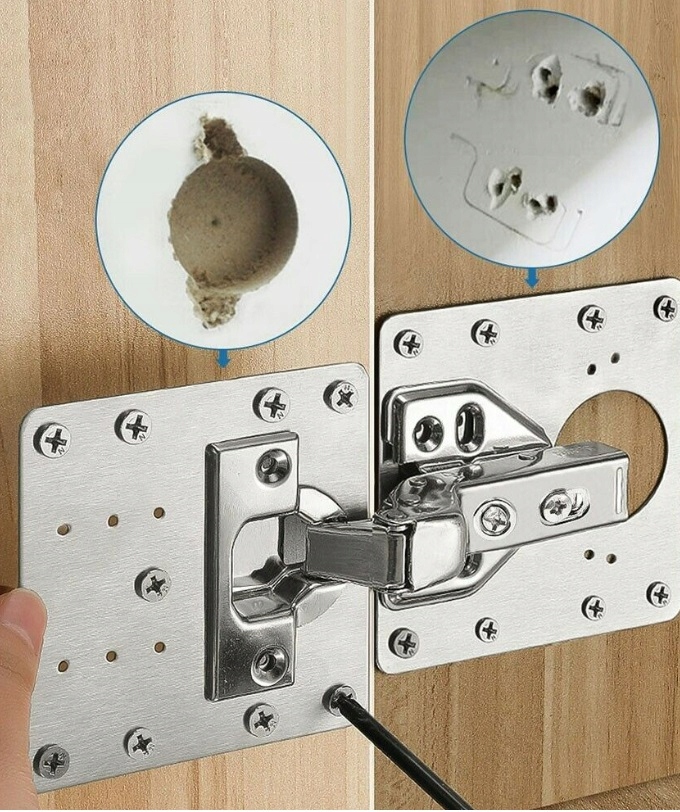 ☑️Прикрутіть петлю до ремонтної пластини в два протилежних отвори. Залежно від типу петель і відстані в шафі від краю виберіть одну пару отворів.