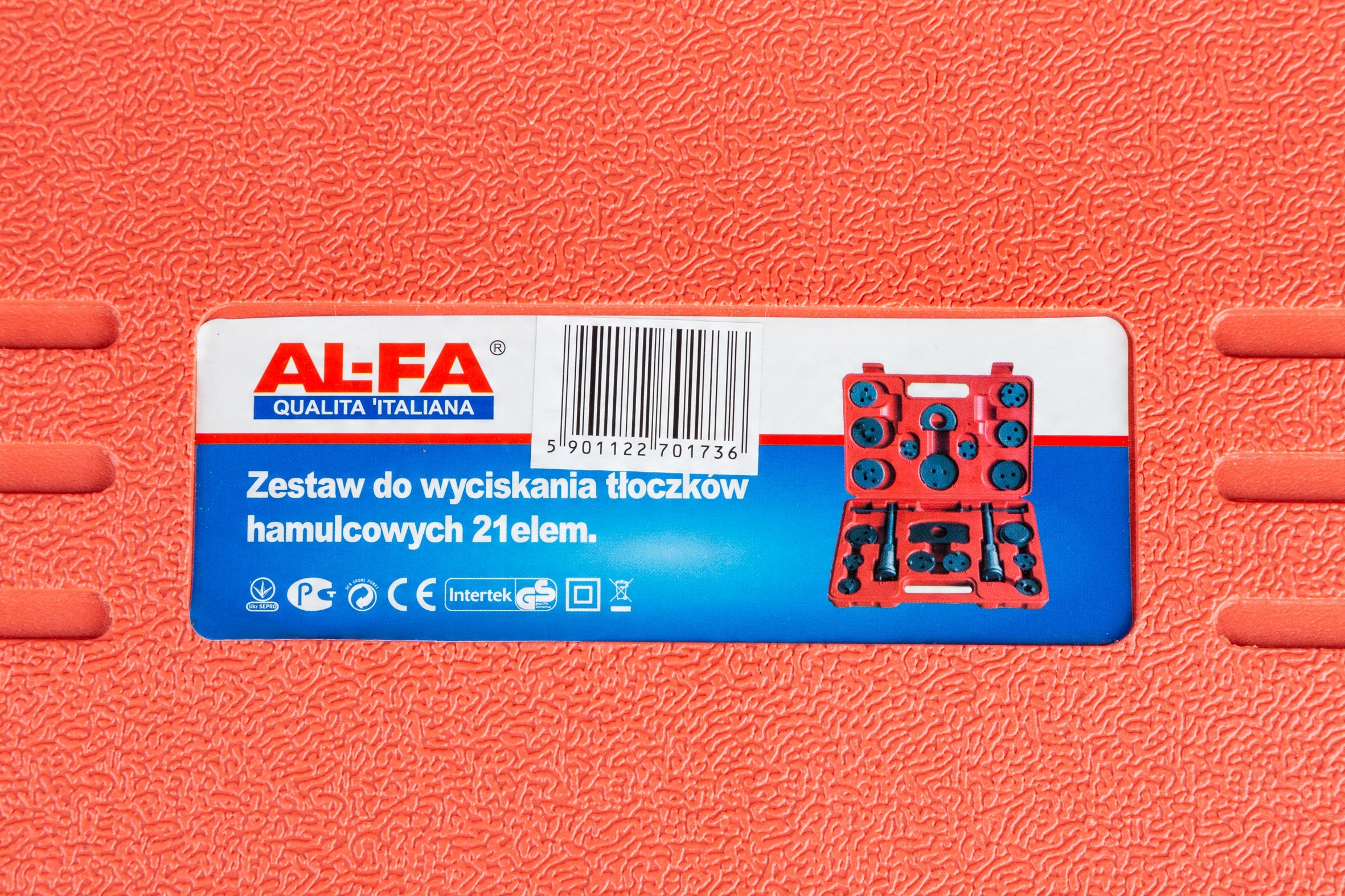 Набір також включає 1 прес і 18 адаптерів, адаптованих до розміру гальмівних поршнів, які використовуються в більшості легкових автомобілів, як європейських, американських, так і азіатських. Нижче наведено перелік окремих елементів набору (номера відповідають вибитим на елементах усередині валізи).