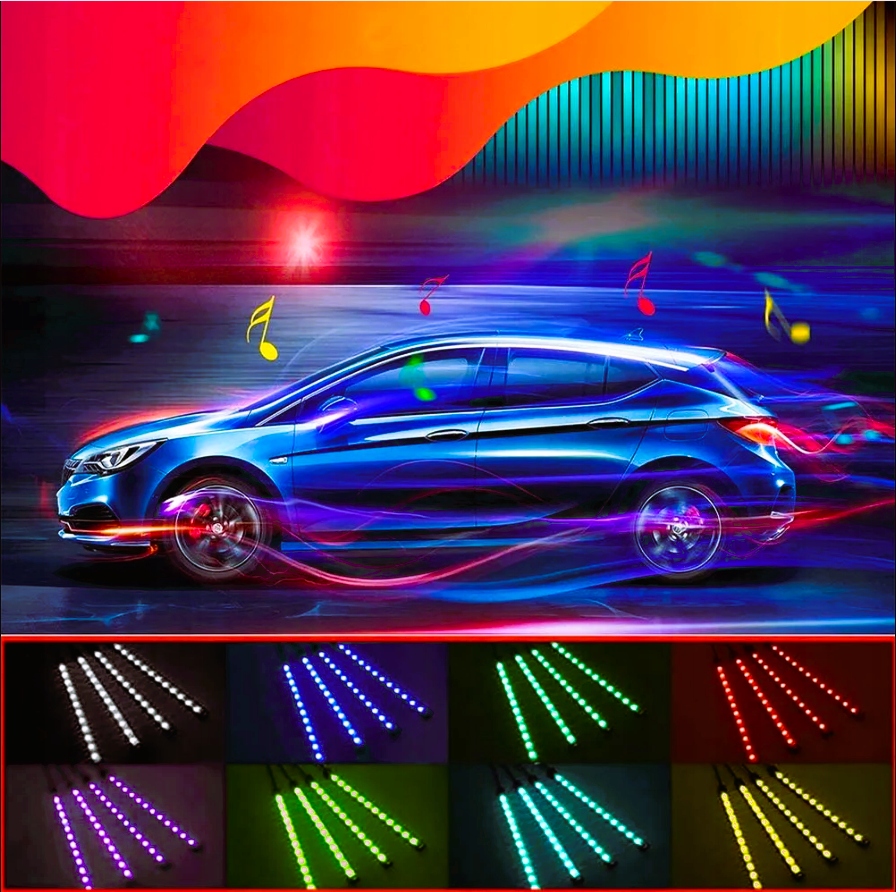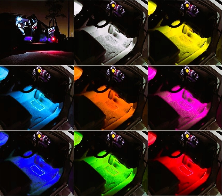 Тепер ви можете контролювати атмосферу у вашому автомобілі. У набір входять чотири світлодіодні ліхтарі, які можна вільно налаштовувати за допомогою пульта дистанційного керування. Зручно змінюйте кольори та режими освітлення, не встаючи з водійського місця!