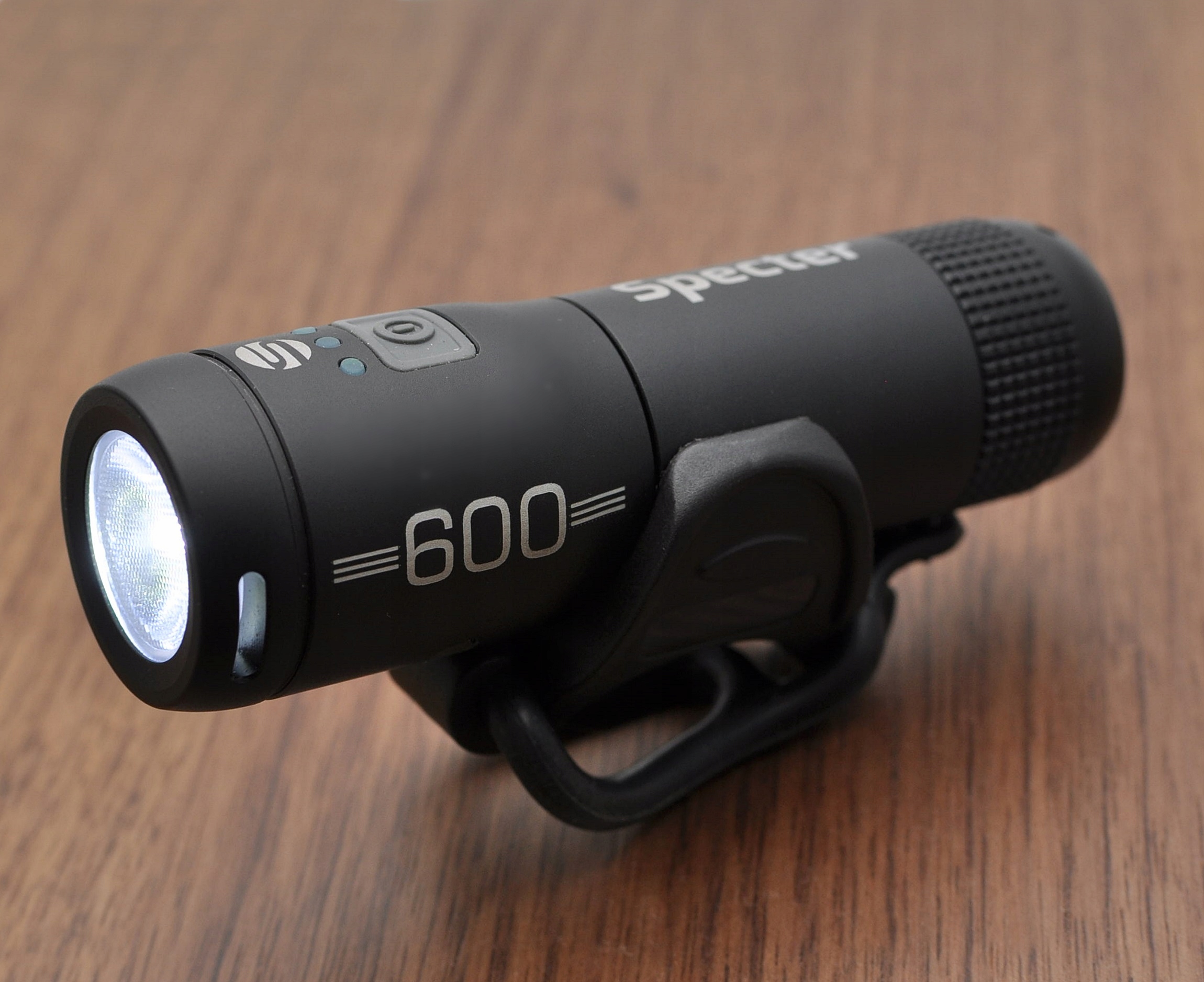 Передня велосипедна фара Spectre 600 має вбудований діод XP-G3, який забезпечує потужний світловий потік 600 люмен. Об’єктив має структуру, яка забезпечує розсіяне світло з дальністю 140 м.
