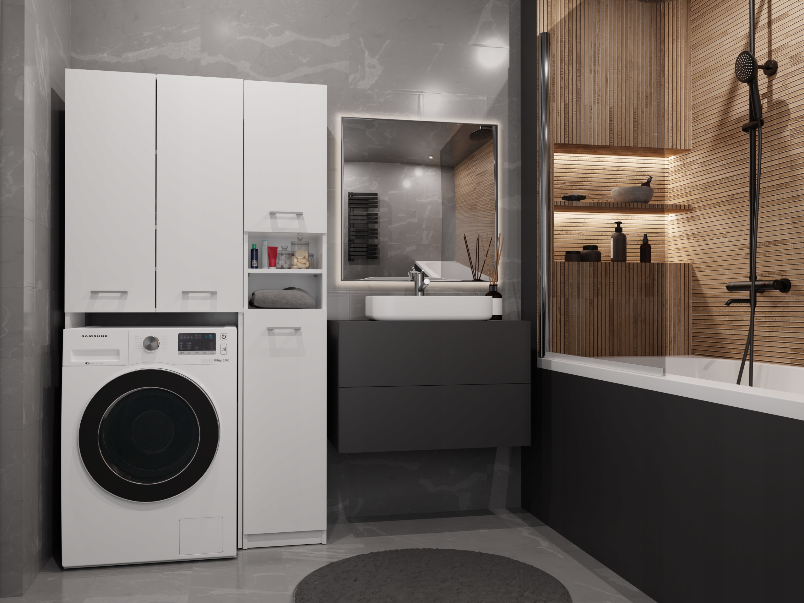 У кожній ванній кімнаті є речі, які потребують окремого місця. Завдяки практичним стійкам ви отримаєте простір для пральної машини та ефективно контролюєте безлад, не займаючи зайвого місця.