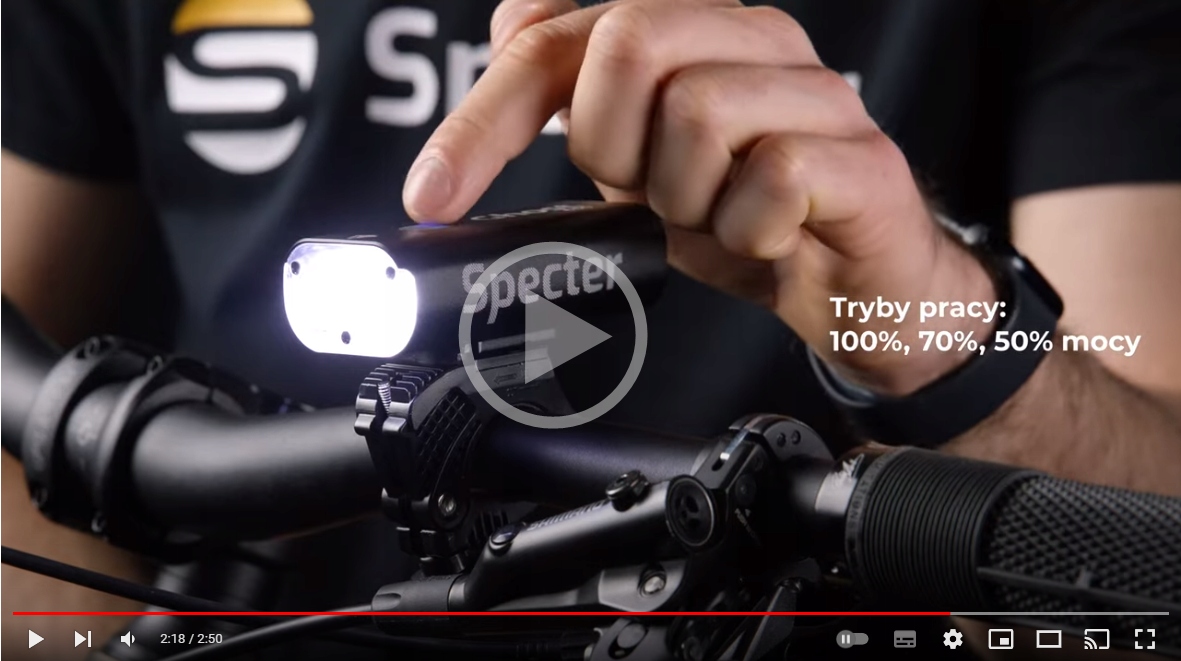 Specter Ghost650 оснащений двома потужними LED діодами, що генерують максимальний світловий потік 650 люмен. Корпус лампи виготовлено з алюмінієвого сплаву, що робить її дуже стійкою до пошкоджень і відносно легкою. Ця модель водонепроникна, тому працюватиме навіть у гірших погодних умовах. Інтуїтивно зрозуміле керування забезпечує одна силіконова кнопка. Ghost650має аж 5 режимів освітлення. Завдяки вбудованому акумулятору 4400 mAh світить до 3 годин в режимі 100%. Ліхтар заряджається через кабель USB типу C і входить до кожного переднього велосипедного ліхтаря. Вимикач лампи світиться. Поки лампа заряджається, перемикач підсвічування блимає зеленим, а лампа заряджається постійним зеленим світлом. Коли лампа розряджена, перемикач світиться червоним. У набір також входить міцна обертова ручка, яка дуже проста у використанні, а для її збирання та розбирання не потрібні додаткові інструменти.
