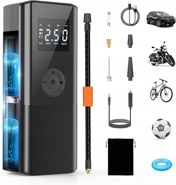 Сучасний, компактний і надзвичайно ефективний електричний насос AOKBON 12V - ідеальне рішення для водіїв і активних людей. Завдяки потужному двигуну, інтелектуальному РК-дисплею і живленню як від вбудованого акумулятора, так і від автомобільної розетки 12 В - ви можете накачати шини в будь-якому місці і в будь-який час.