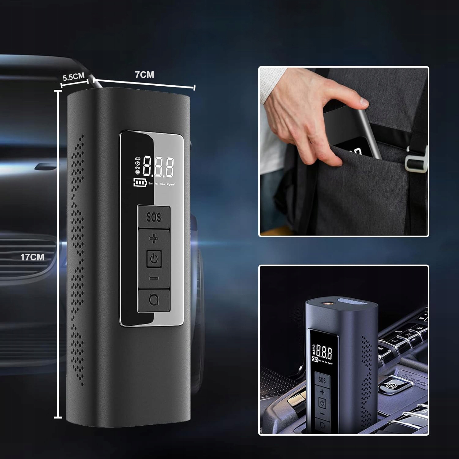 - Порівняно з іншими портативними повітряними насосами, які живляться лише від батареї та можуть використовуватися лише після повного заряду, ми вирішив цю проблему. Ви можете вимкнути бездротовий повітряний компресор і підключити його до прикурювача автомобіля, щоб безпосередньо накачати шини автомобіля (переконайтеся, що двигун автомобіля увімкнено). Це справжній аварійний компресор шин.