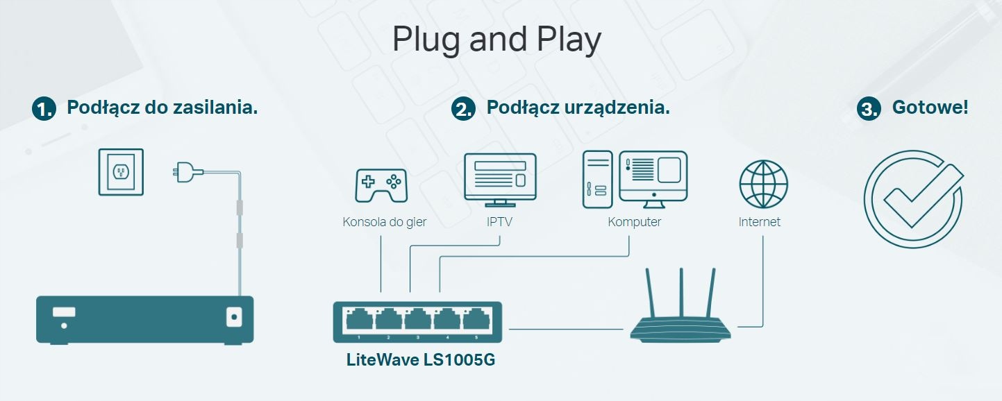 ✅ Некеровані комутатори LiteWave TP-Link — це простий і економічно ефективний спосіб розширити дротову мережу. Прилади прості у використанні та надійні. Завдяки установці Plug and Play підключення нових пристроїв займає всього кілька хвилин. Усі порти підтримують Auto-MDI/MDIX, тож вам не доведеться витрачати час на вибір потрібного кабелю.
