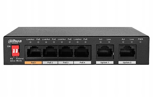 Пристрій використовує чотири порти PoE, кожен з яких дозволяє живити цільовий пристрій із споживаною потужністю не більше 30 Вт (виняток становить перший порт із підтримкою для стандарту Hi-PoE, який може забезпечити потужність до 60 Вт). Додатковою перевагою комутатора Dahua PoE є функція, пов’язана з інтелектуальним механізмом захисту, який постійно регулює енергоспоживання у разі перевантаження.