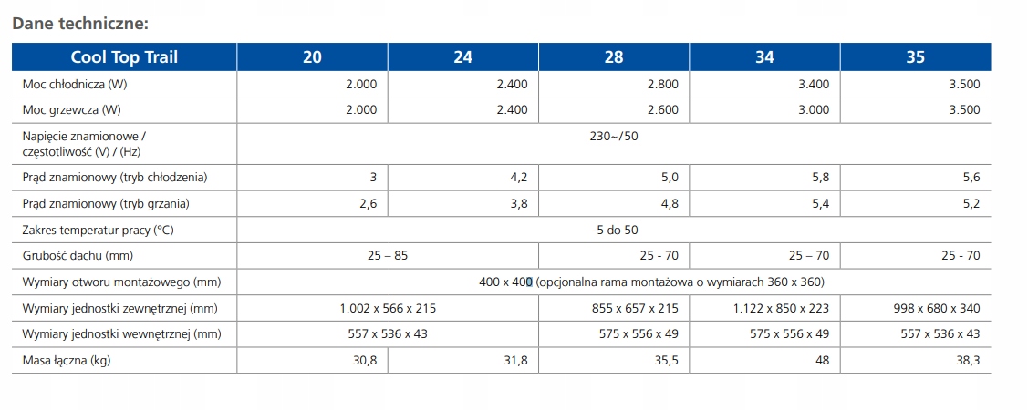 - Кондиціонери Cool Top Trail розроблені для дахових отворів 400x400 мм (їх також можна встановити в менші отвори 360x360 мм за допомогою адаптерів, як аксесуари).
