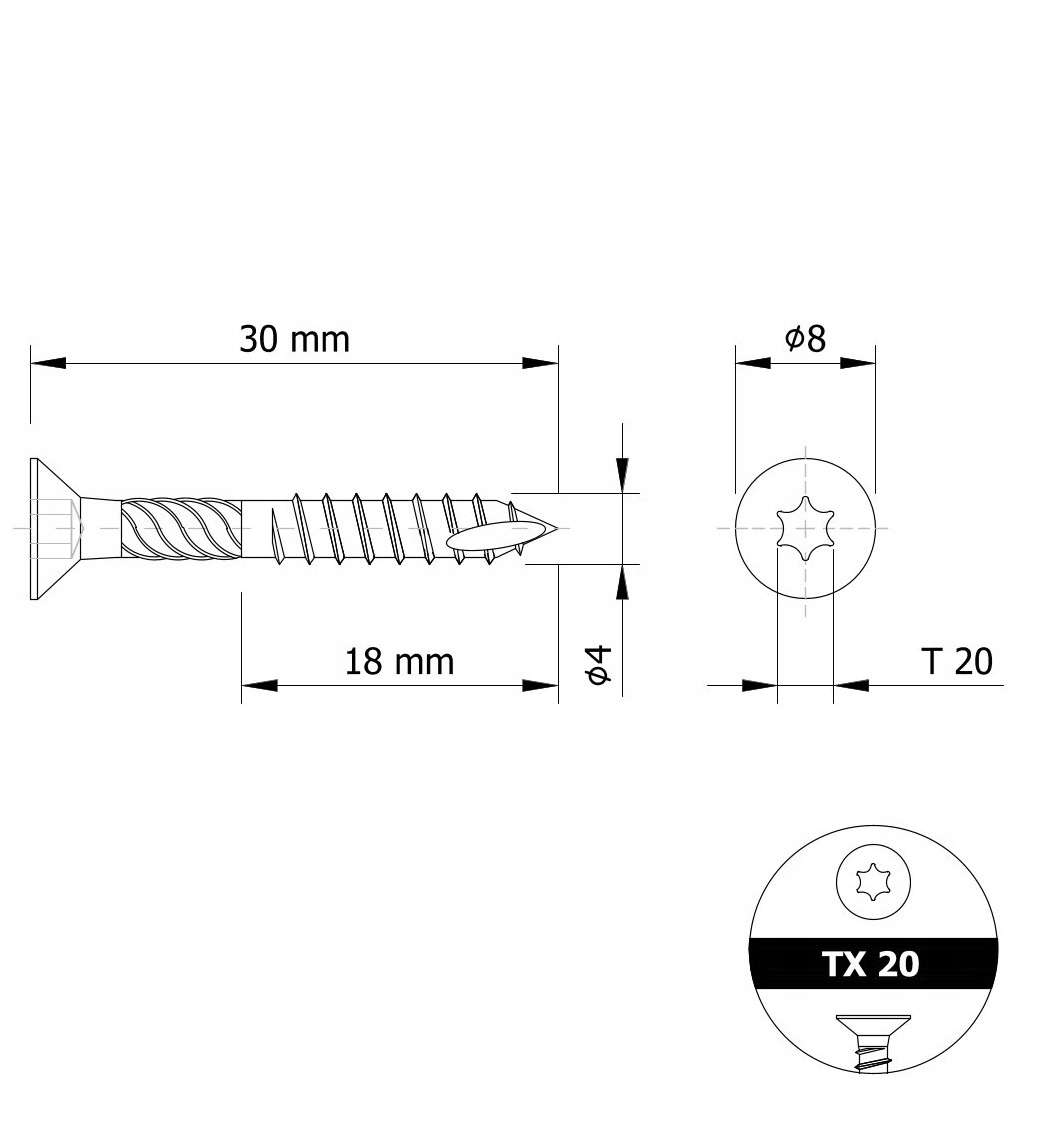 Конічний шуруп по дереву Unix до Torx 4,0 x 30 мм