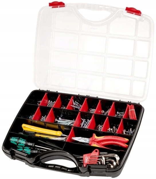 Професійний контейнер Parat для зберігання дрібних елементів, інструментів, деталей, кабельних наконечників тощо, корисних для всіх видів електронної, механічної, модельної роботи тощо, а також домашнього застосування.