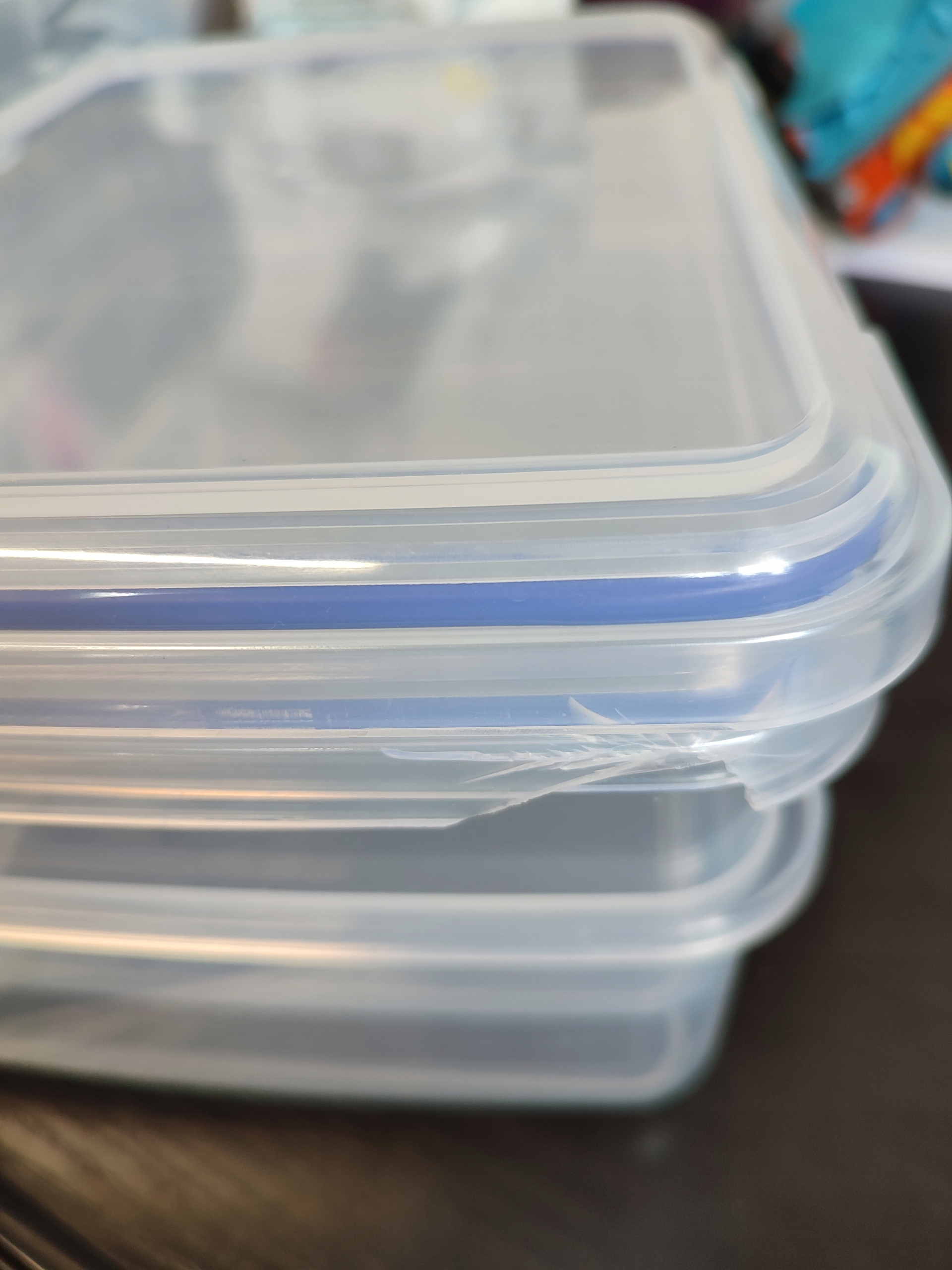 Товар новий - після виставки на одній з кришок є невелика ТРІЩИНА, яка не впливає на закриття контейнера. Реальні фотографії нижче.