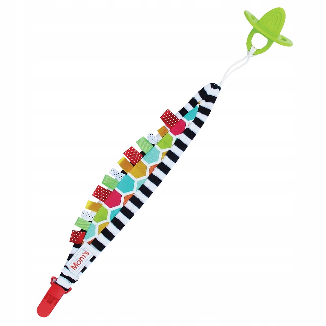 Барвистий тримач для пустушки виготовлено з матеріалів найвищої якості, безпечних для Твоя дитина. З одного боку кулон має затискач, який дозволяє прикріпити іграшку до одягу дитини, а з іншого - прорізувач з безпечного силікону, який ідеально підходить для прорізування зубів у дітей. Не забуваємо і про правильний розвиток зору. Переважання чорно-білих елементів розвиває правильне колірне сприйняття. Додаткові кольорові мітки заохотять до гри, одночасно розвиваючи дрібну моторику та спритність пальців малюка.