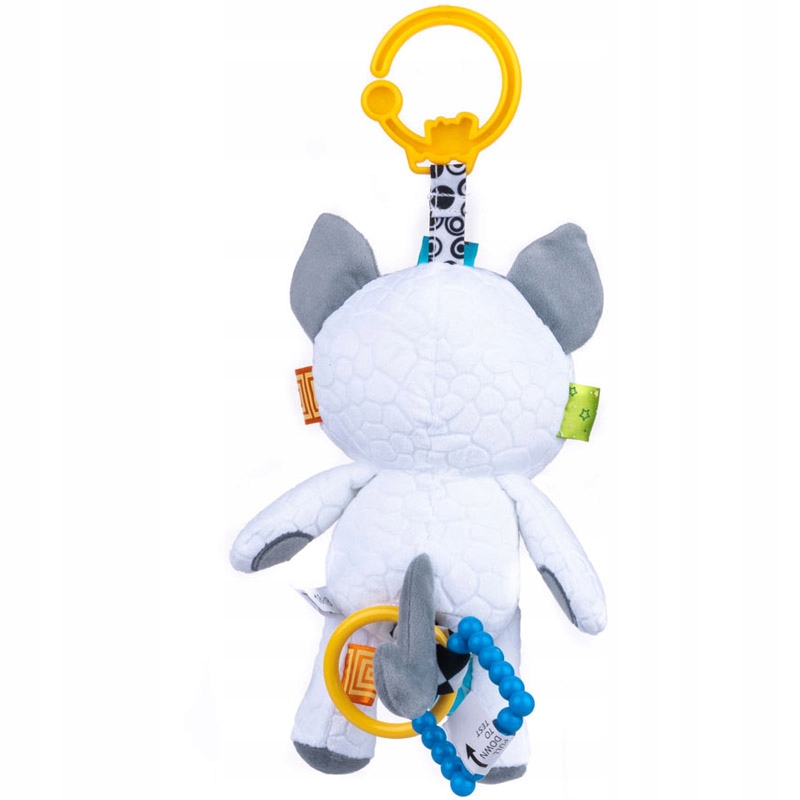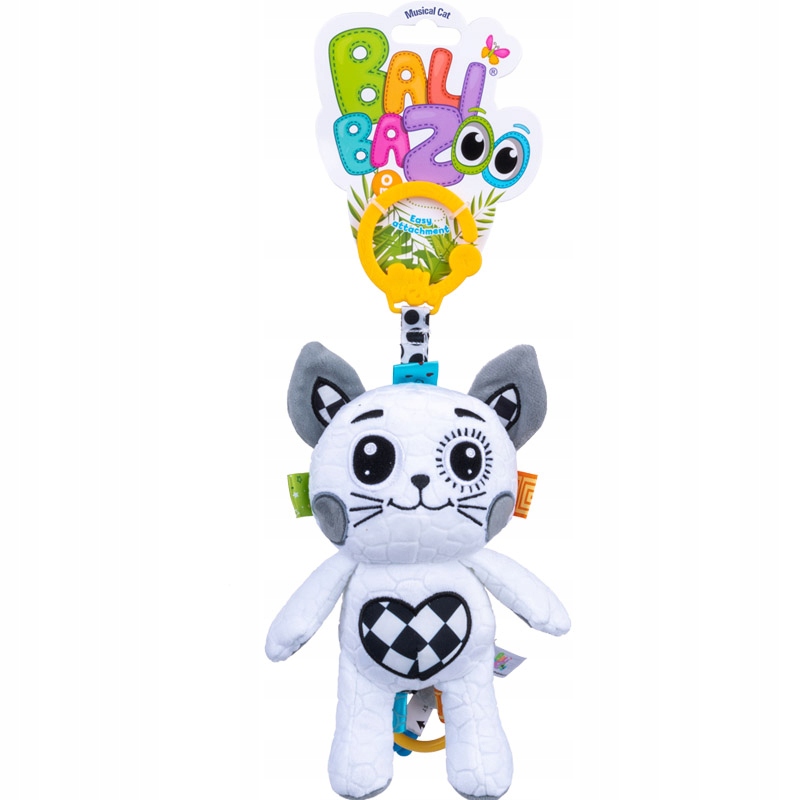 Кішка-підвіска з музичною скринькою — це більша м’яка іграшка та перший друг малюка. Його можна брати з собою всюди і, завдяки зручній ручці, прикріпити в обраному місці. Завдяки високим контрастам кольорів і візерунків вона надзвичайно стимулює зір малюка з дня народження, а приємна мелодія музичної скриньки зробить час перед сном приємнішим.