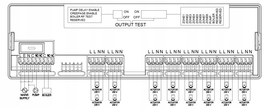 Зони 1-8: до кожної зони можна підключити 2 приводи, що дає загалом максимум 16 приводів (схеми ) на смугу: кімнатний термостат підпорядкованого блоку або підпорядкований пристрій приводу