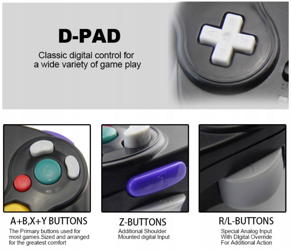 Ідеально підходить як для класичних ігор, так і для динамічних ігор. Висока якість виготовлення та ідеально відтворений дизайн роблять його чудовою альтернативою оригінальним контролерам GameCube.