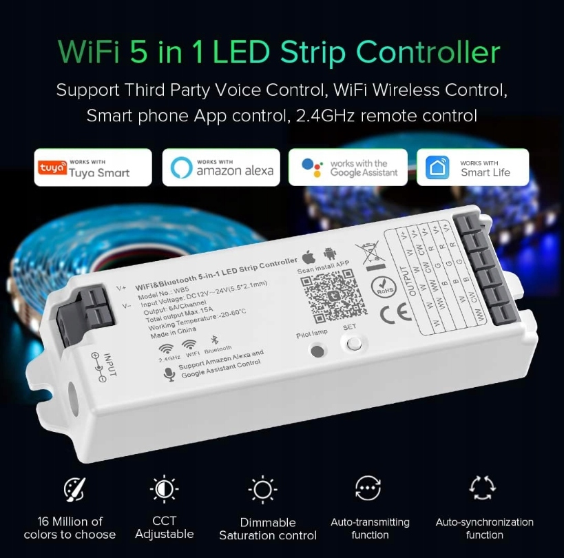 - Цей контролер підтримує монохромне управління стрічкою , WW+CW, RGB , RGBW, RGB+CCT. доступні дві версії: WB5 та WL5. Існує невелика різниця в продуктивності між ними. B> Цей контролер працює з Alex та Google Assistant. >