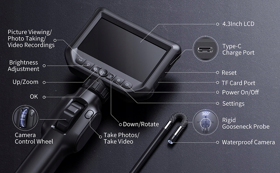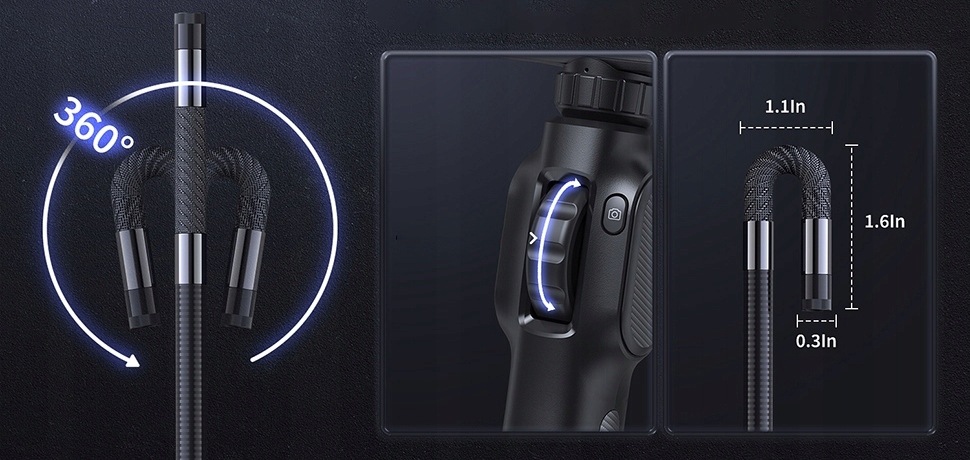 Мініатюрний зонд діаметром 8 мм легко маневрувати в тісних місцях. Завдяки 360 ° Два -шляху обертового зонду, який виключає необхідність частого регулювання кабелю, ви можете всебічно перевірити різні області, просто обертаючи ручку управління зміїною камерою. Це дозволяє досягти складних внутрішніх місць, які раніше були недоступними для перегляду.
