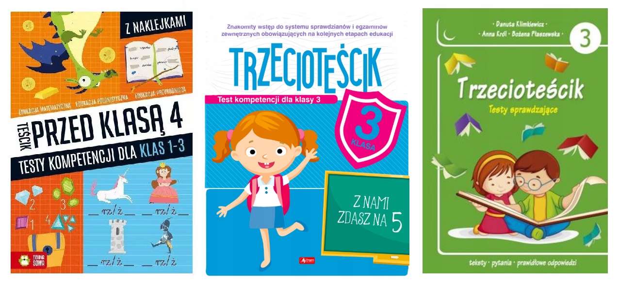 Книга призначена для учнів третього класу початкової школи Trzecioteścik, є чудовим вступом до системи тестів і ЗНО, які застосовуються на наступних етапах навчання, і містить тести з полоністики, математики, історії та природничих наук. Тести розроблено на основі Базової навчальної програми загальноосвітньої школи для початкової школи. Кожен з них перевіряє різні набуті навички. Тести складаються із закритих завдань, у яких дитина обирає одну правильну відповідь із трьох запропонованих, і відкритих завдань, у яких дитина самостійно формулює відповідь.