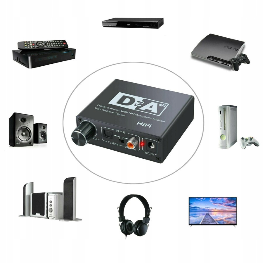 Конвертер дозволяє двостороннє перетворення аналогових і цифрових сигналів. Користувачеві доступні вхідні роз’єми коаксіальний RCA та оптичний Toslink. Вихідні роз’єми: роз’єм для навушників 3,5 мм, 2x RCA (аудіо Л/П), коаксіальний та Toslink.