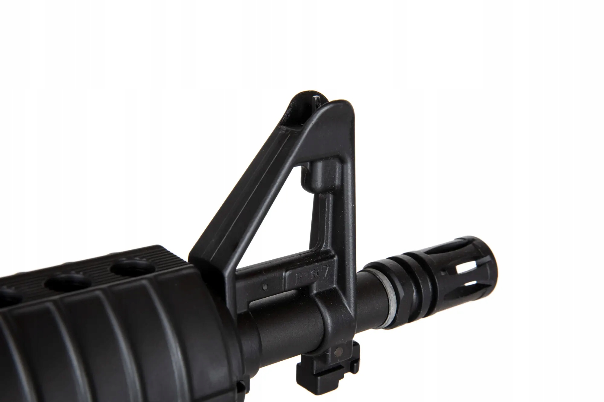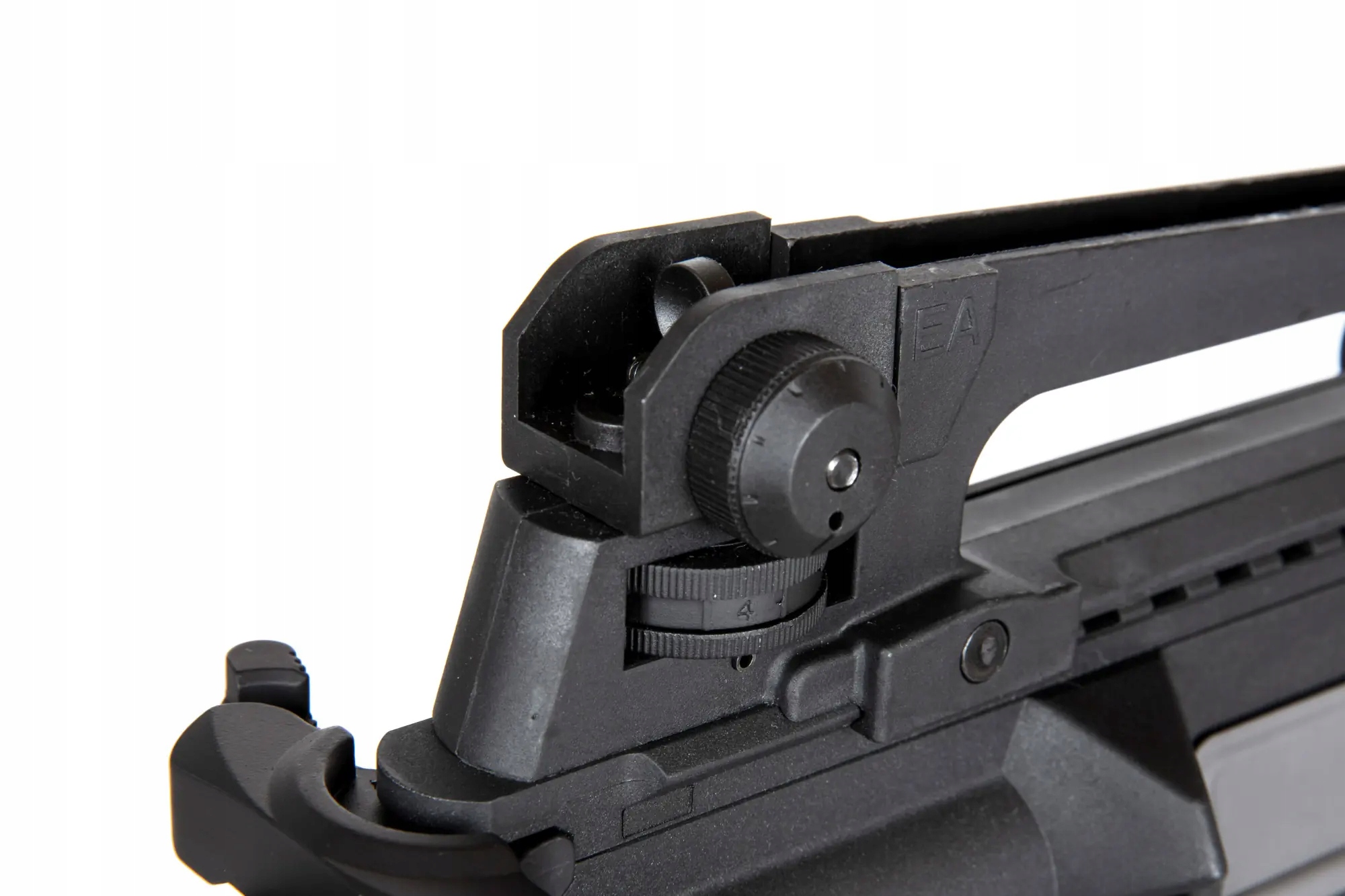 На верхній планці RIS встановлена класична транспортувальна рукоятка з ціликом. Завдяки висувному прикладу з протиковзким текстурованим затильником можна регулювати довжину репліки відповідно до комплекції та вподобань стрільця. Штатний пламегасник кріпиться на ліву різьбу 14 мм, що дозволяє підключити на його місце шумопоглинач.