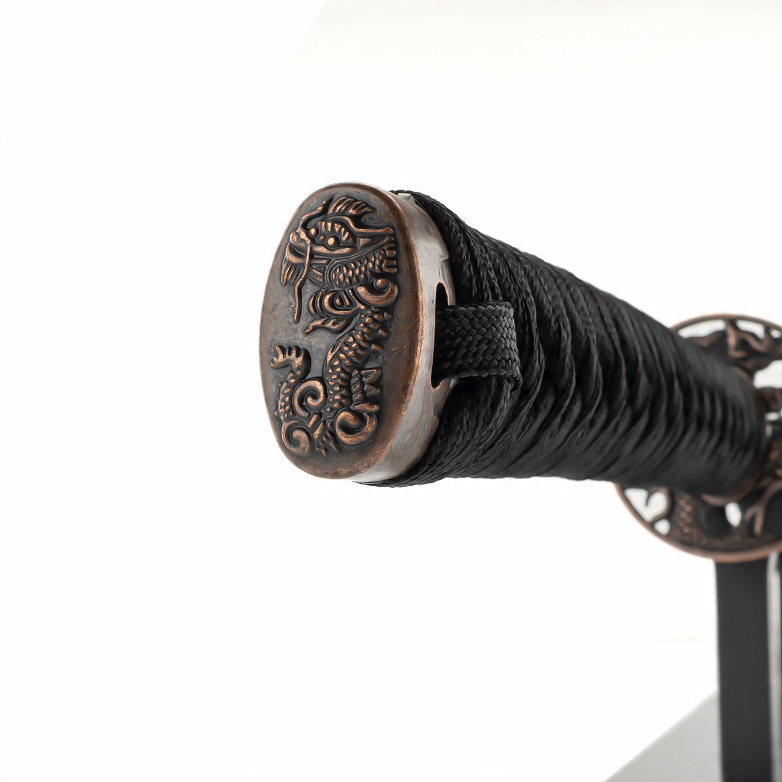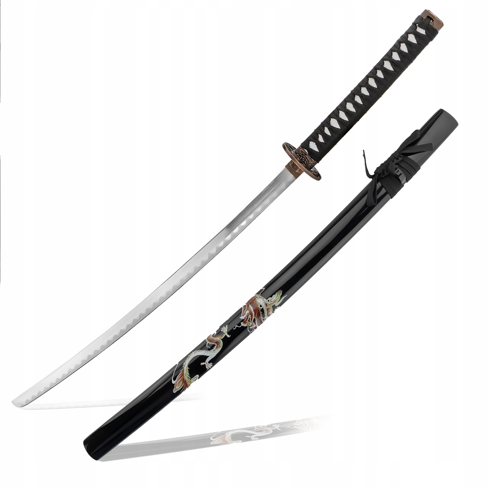 Цей ідеальний самурайський меч із піхвами є точною копією катани з злегка загострене лезо. Піхви виготовлені з деревини твердих порід і прикрашені мотивом дракона. Це надзвичайно оригінальна прикраса вітальні, їдальні та будь-якого іншого інтер'єру. До меча також додається спеціальна підставка з присвятою.