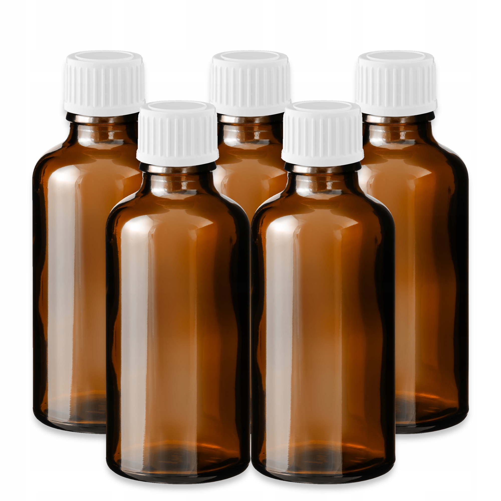 КОРИЧНЕВА СКЛЯНА ПЛЯШКА 50 МЛ З БІЛОЮ ПЛАСТИКОВОЮ КРИШКОЮ - НАБІР З 5 ШТ.