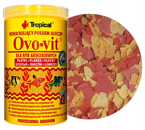 Ovo-Vit - це корм, який доповнює раціон риб цінним білком, ненасиченими жирними кислотами та легкозасвоюваним лецитином з яєчних жовтків. Пластівці Ovo-Vit сприяють росту, дозріванню та нересту риб, тому їх особливо рекомендують для нересту та молодих, зростаючих риб, потреба яких у поживних речовинах особливо висока. Висока поживна цінність пластівців Ово-Віт також може бути використана в період реконвалесценції, коли риби потребують особливого догляду та високоенергетичного, легкозасвоюваного корму, багатого вітамінами та мікроелементами. Заслуговує на увагу високий вміст стабілізованого вітаміну С, який, крім іншого, посилює стійкість риби до захворювань, прискорює загоєння ран і саден, а також відіграє важливу роль у розвитку молоді риби, запобігаючи деформації кісткової системи.