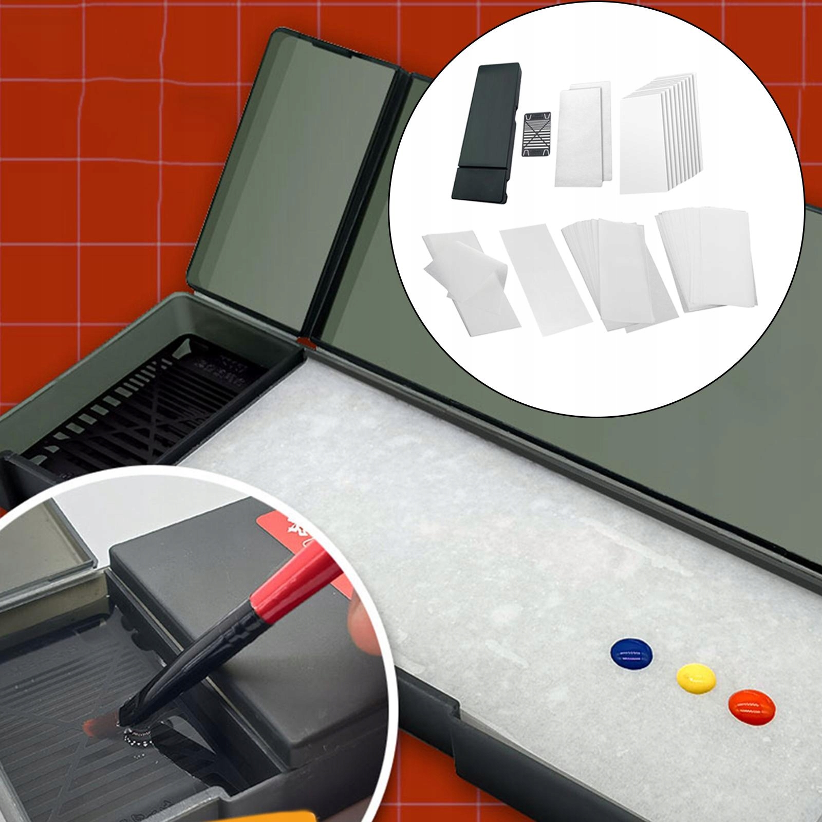 Опис: МАТЕРІАЛ: Коробка для фарби виготовлена з високоякісного матеріалу, довговічна. ЛЕГКИЙ У ВИКОРИСТОВУВАННІ: Палітри для малювання зі станцією для миття пензлів з нержавіючої сталі, зручні у використанні. ПАПІР ДЛЯ ЗМІШУВАННЯ КОЛЬОРІВ ДИФУЗІЙНОГО ТИПУ: Хороша водопроникність, підходить для ляльок, людських фігур або інших моделей, які вимагають кількох переходів кольорів. ЗАСТОСУВАННЯ: Лоток з пігментом підходить для розфарбовування фігурок, моделей автомобілів, ляльок, людських фігурок тощо.