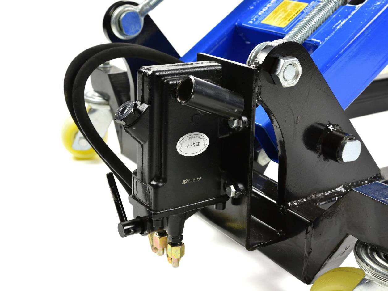 Гідравлічний підлоговий домкрат, призначений для підтримки монтажу та демонтажу коробок передач, диференціалів тощо. Міцнасталева конструкція в поєднанні зшвидкою гідравлічною системою A Підйомник вантажопідйомністю до 3 тонн виправдає очікування навіть найвимогливіших користувачів. Він має два стяжки, призначені для регулювання кута монтажної основи. Легке маневрування підйомником можливе завдяки комплекту з чотирьохповоротних коліс на підшипниках, виготовлених з поліаміду. У комплект також входять чотири незалежно регульовані ручки і два ланцюги, призначені для кріплення демонтованого елемента.