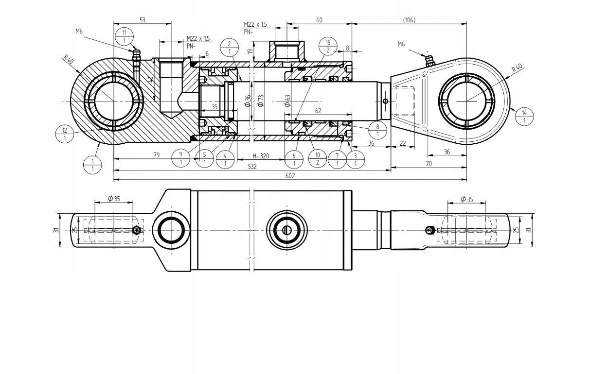 Короткий привід на 32 см. Гідравлічний поршневий циліндр