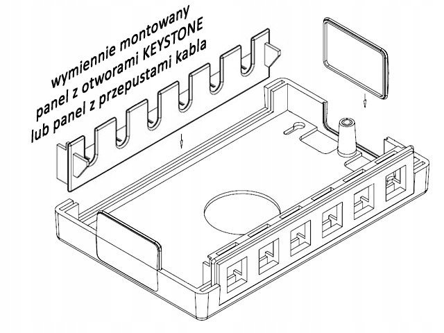 Увага! Конструкція боксу передбачає встановлення 6 модулів KEYSTONE в передню та задню стінки боксу. Також можна замінити панель з отворами KEYSTONE на панель з кабельними вводами (поставляється в комплекті) і встановити тільки 6 модулів в одній стіні.