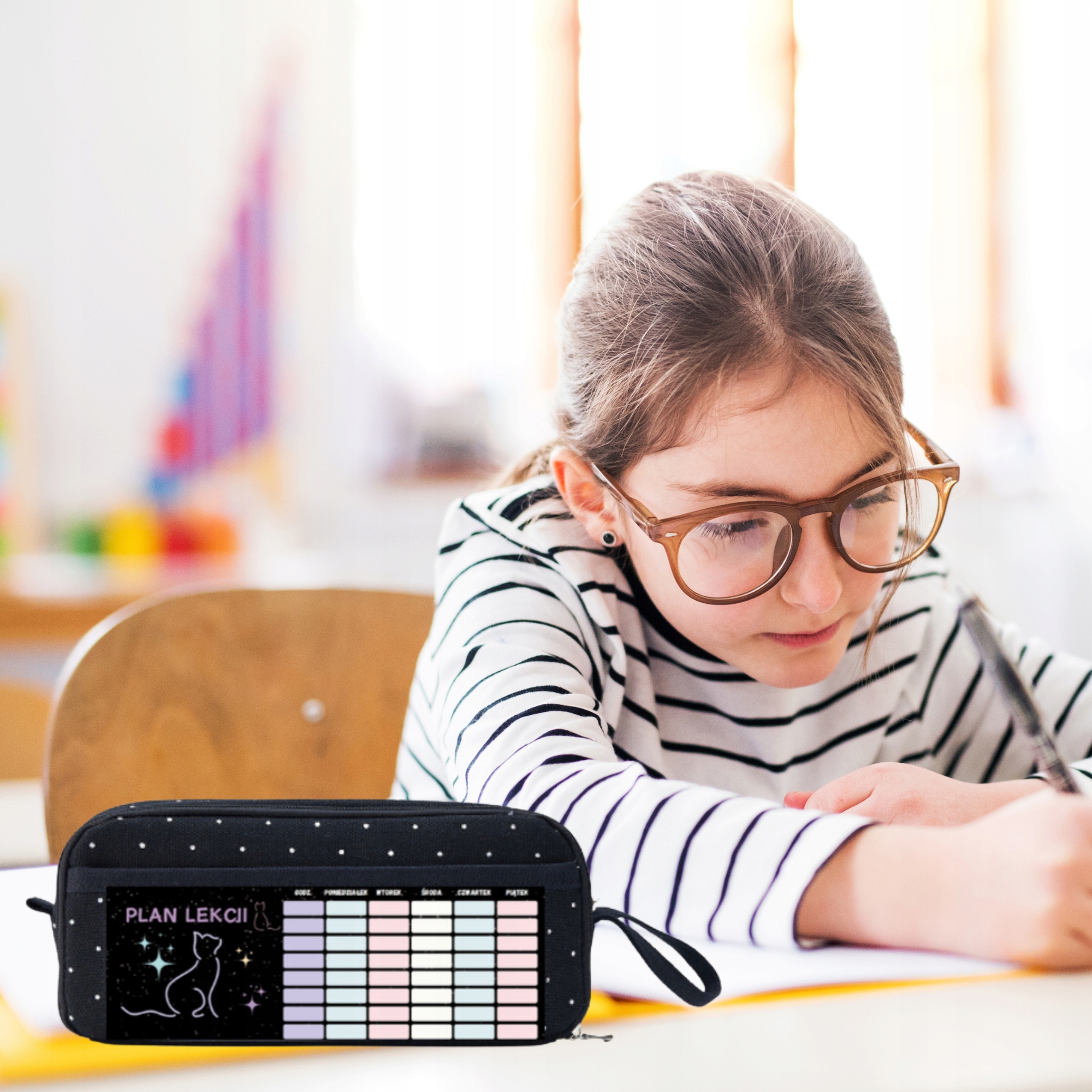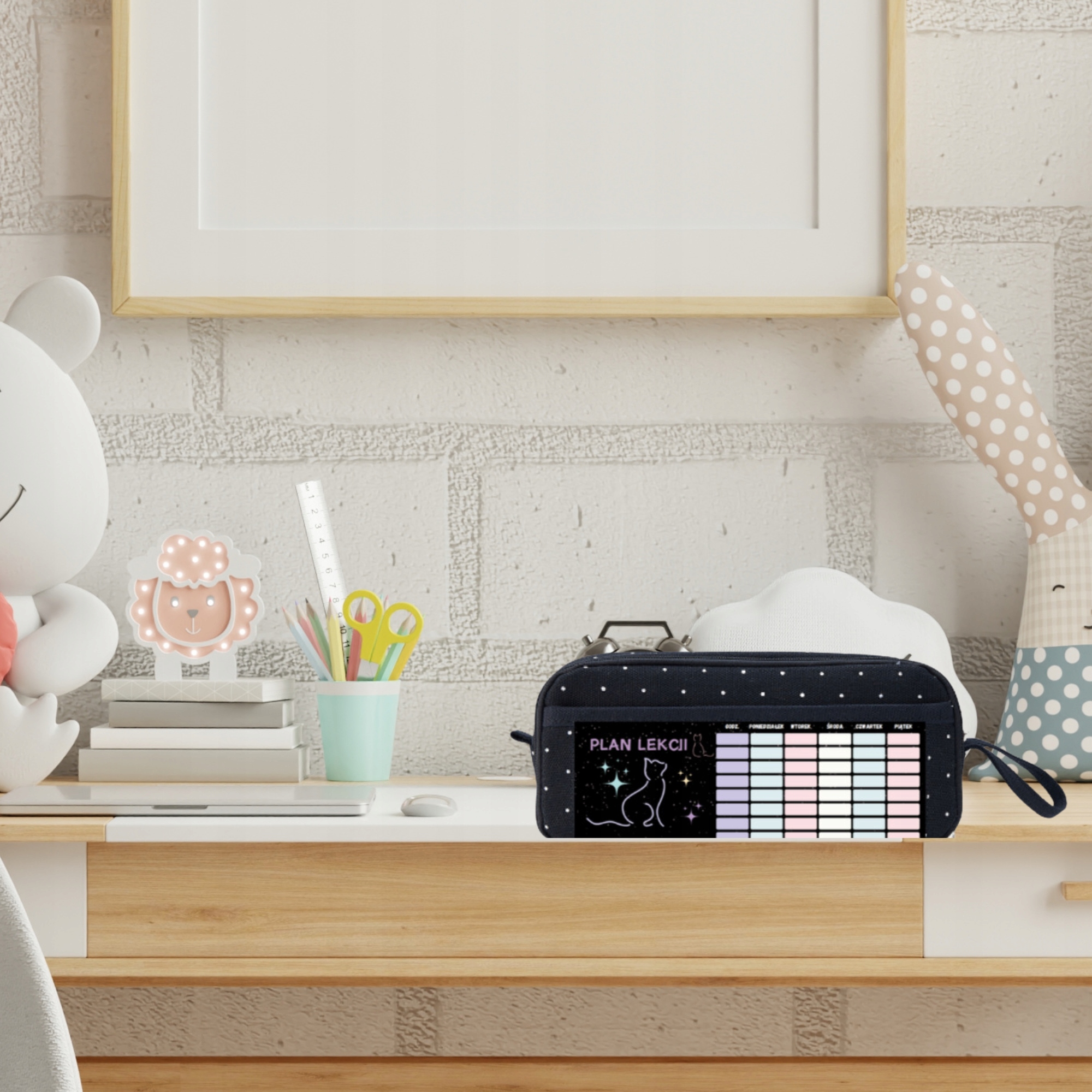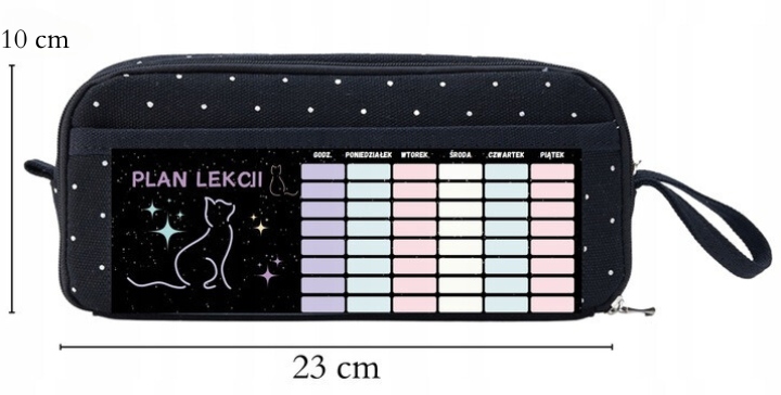 чорний у білих крапках з мотивом чарівної кішки робить випадок олівця не лише функціональним, але й стильним. Це добре поєднується з кожним шкільним рюкзаком і додає трохи сучасності вашому дня.