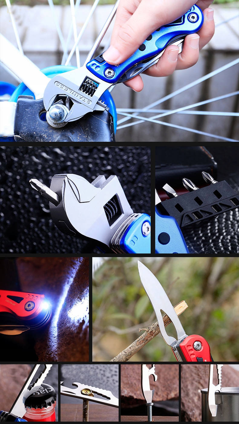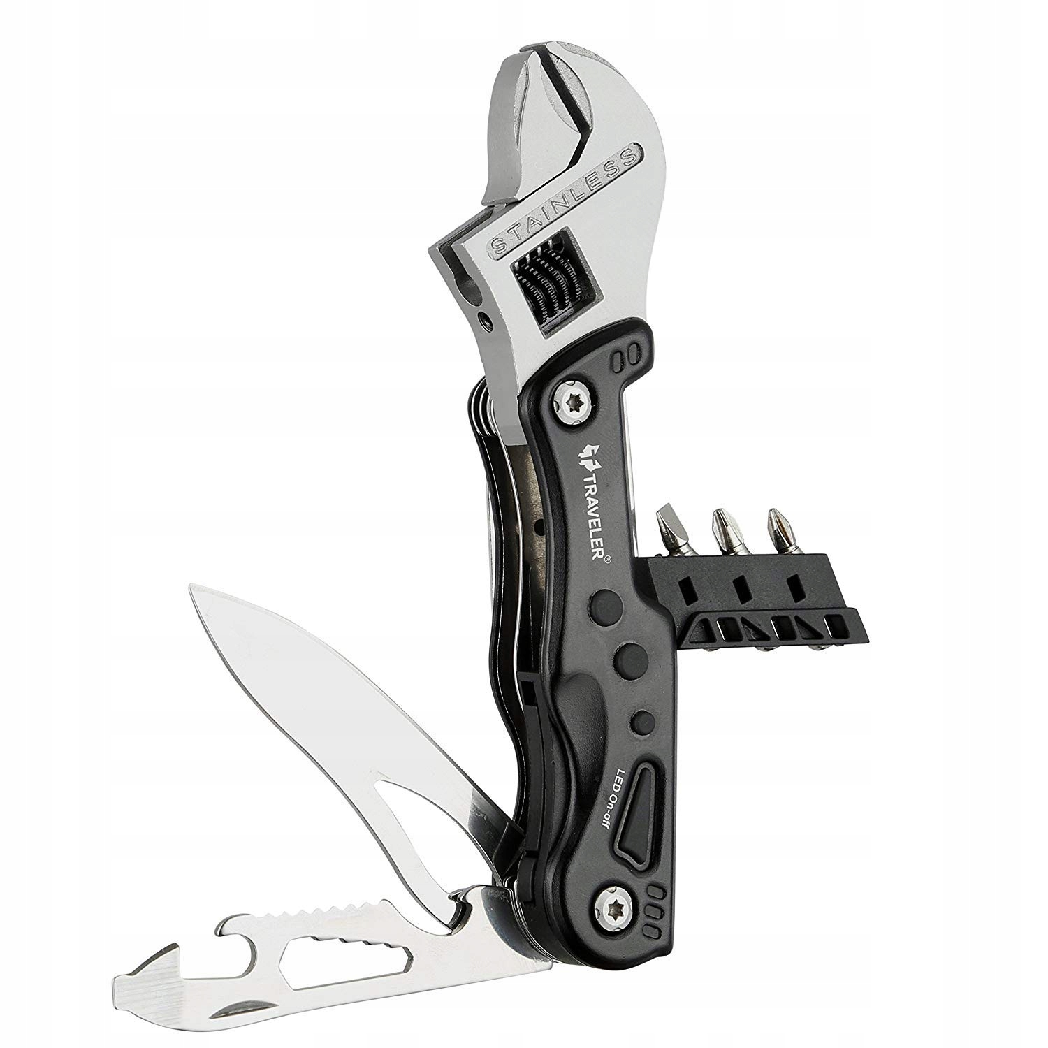 - Це необхідний інструмент для кожного ентузіаста DIY, який варто мати з собою на випадок раптової поломки. Він містить багато функцій в одному інструменті, найважливішою з яких є розвідний (французький) ключ. Додатково має наступні функції: ніж, набір з 3 насадок, універсальний шестигранний ключ, плоска викрутка, пилка та відкривачка для пляшок і консервів. У комплект також входить чорний тканинний чохол для інструменту.