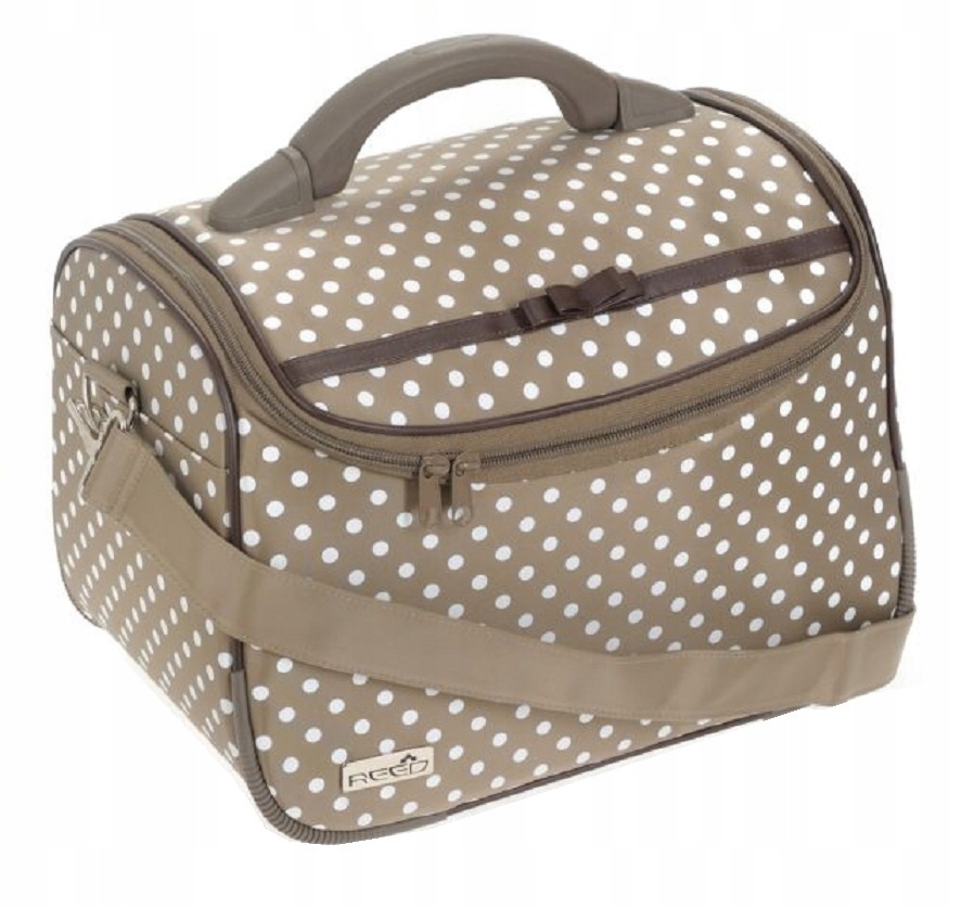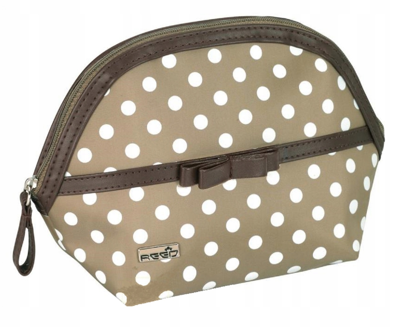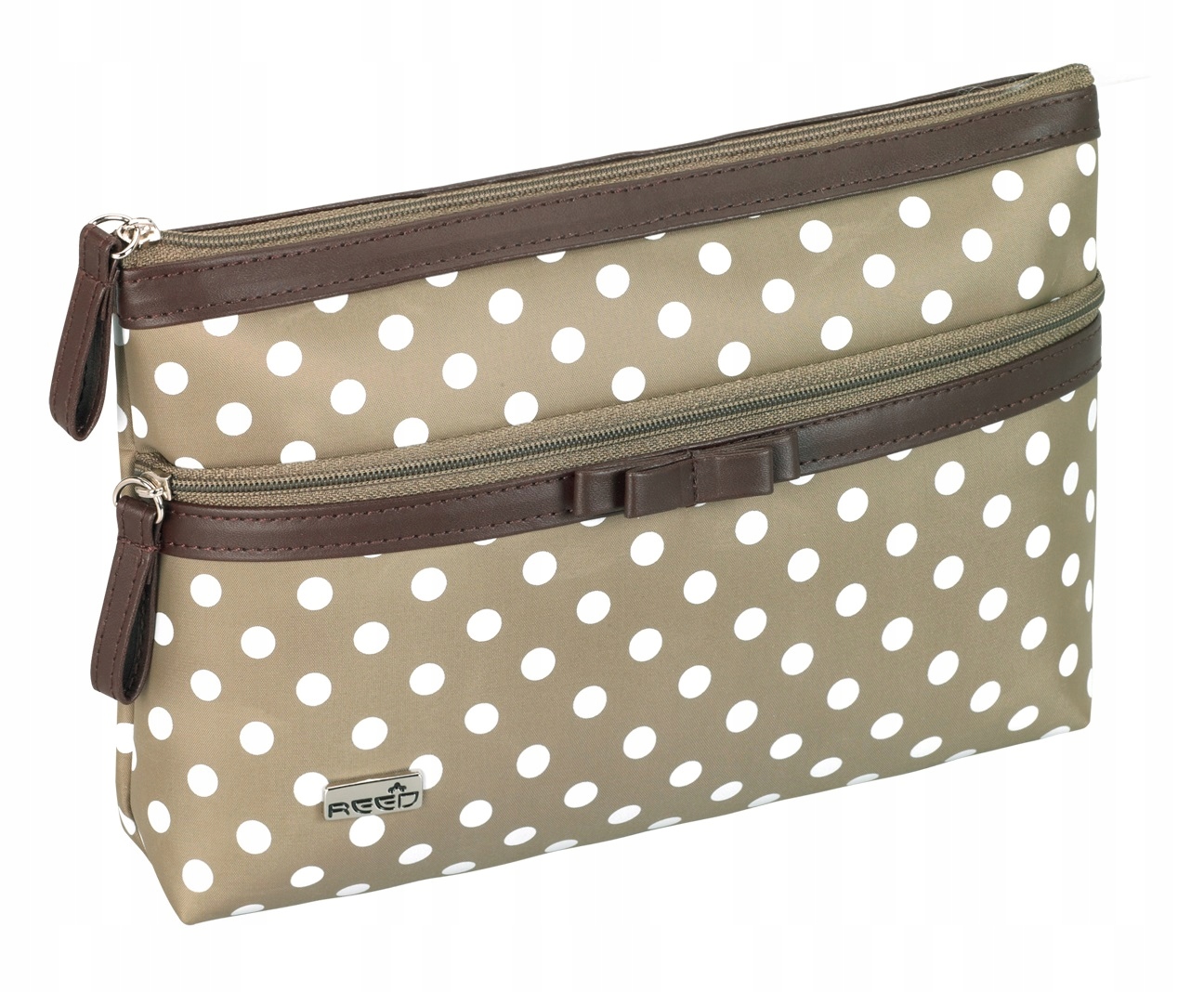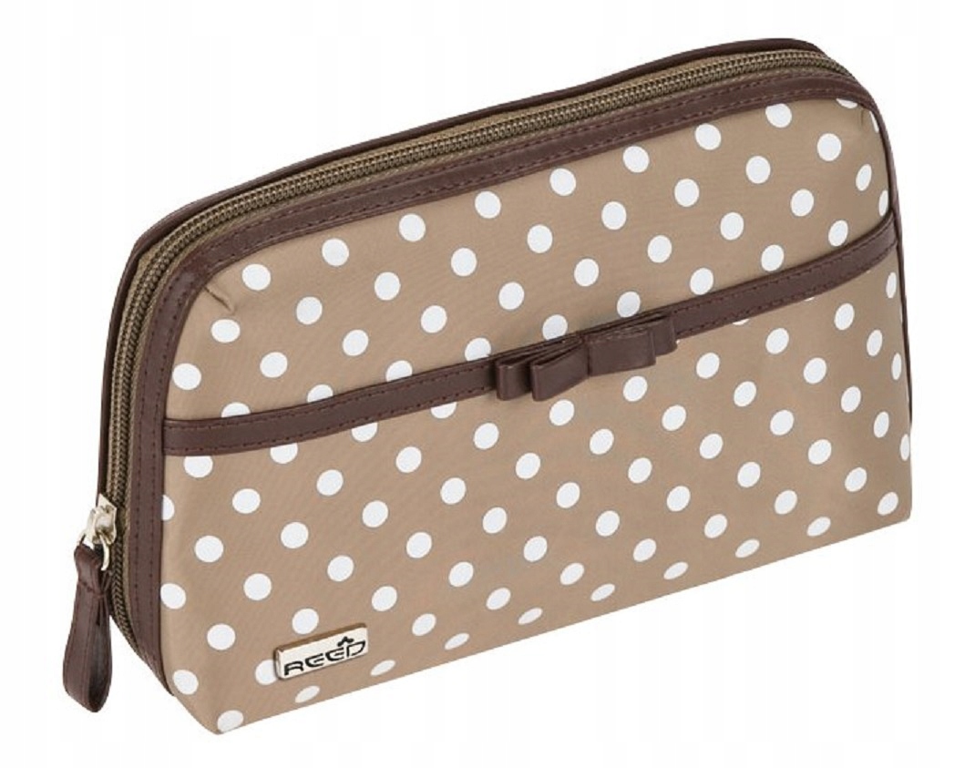 Виготовлений з оливково-бежевого ПВХ матеріалу з великими білими крапками, оздоблений міцною коричневою екошкірою. Інтер'єр виконаний в бежевих тонах. Оздоблення коричневою екошкірою шоколадно-коричневого кольору. Внутрішня частина косметички оброблена оливково-бежевою підкладкою, з сітчастою кишенею, що закривається на блискавку, і додатковою еластичною стрічкою для утримання флаконів і косметики у вертикальному положенні. На лицьовій стороні маленький елегантний металевий логотип REED, компанія REED, що спеціалізується на виробництві чохлів і косметичок. Усі косметички виготовляються з великою увагою до деталей, з високоякісних матеріалів і славляться бездоганною роботою.
