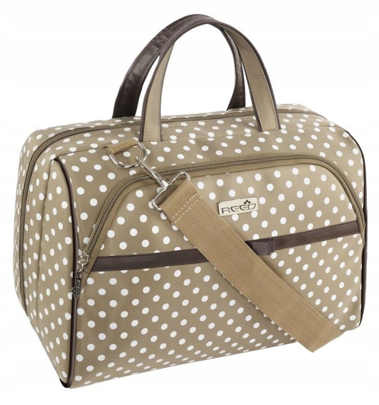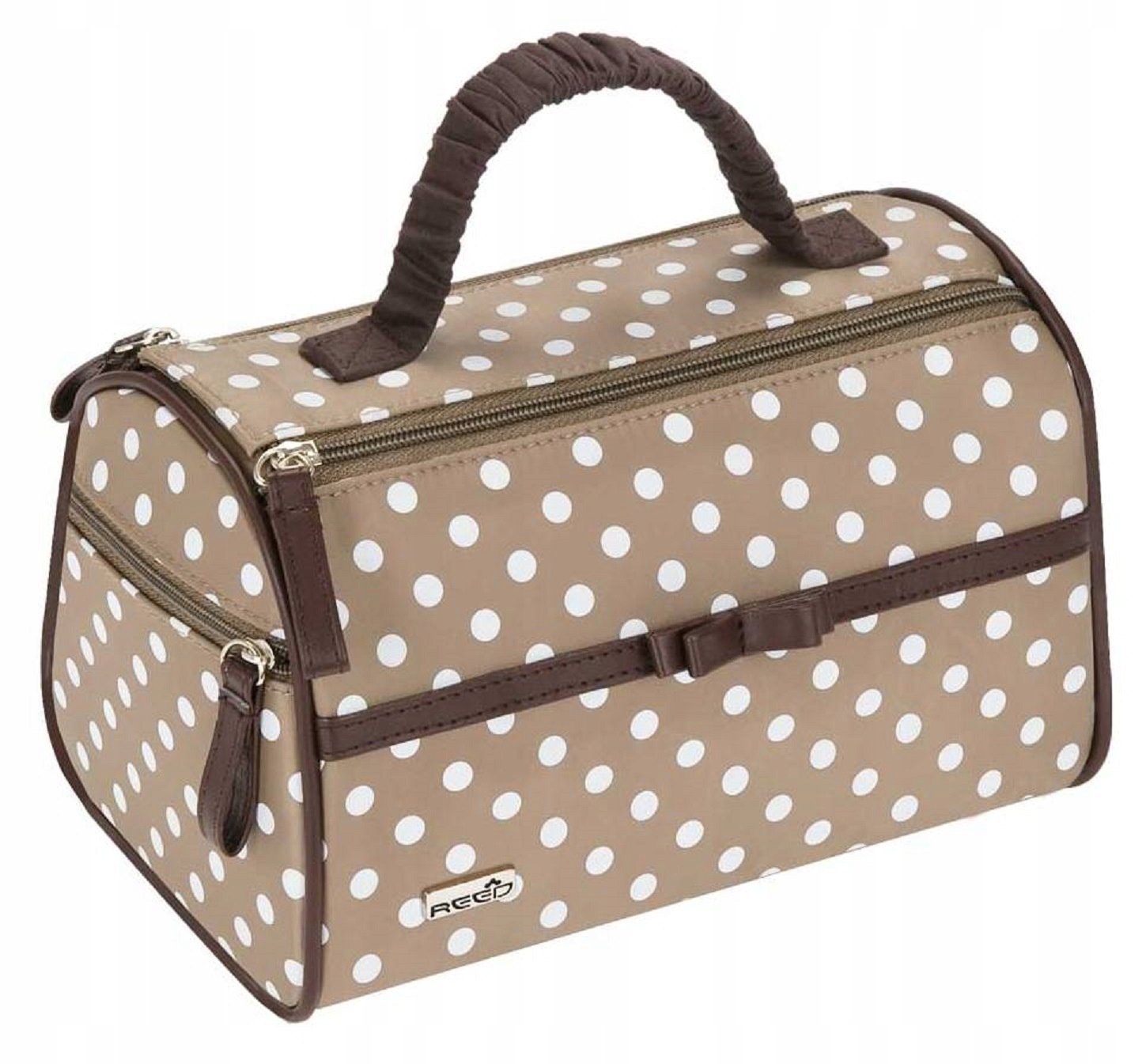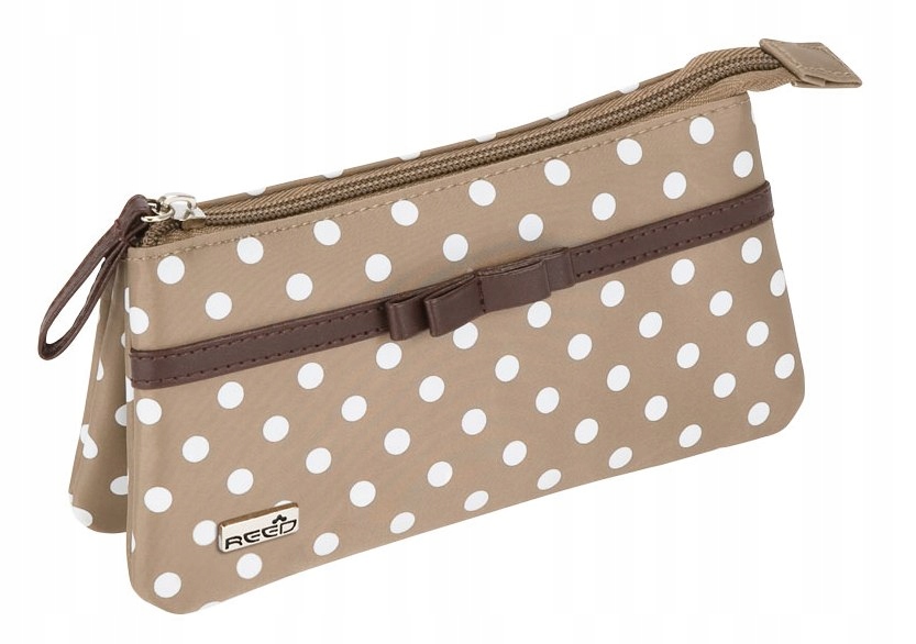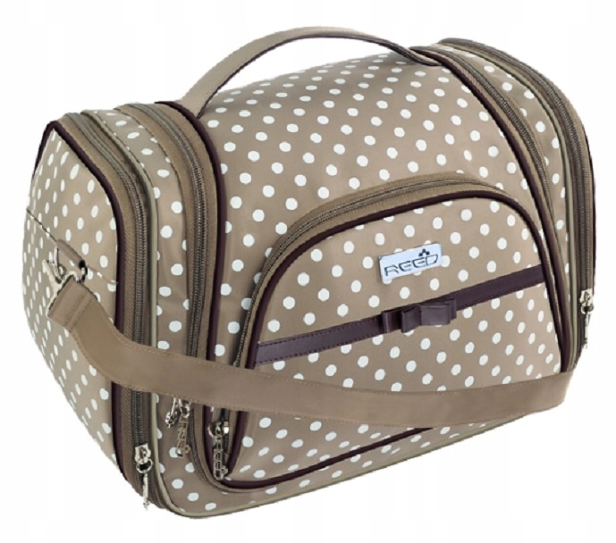 Виготовлений з оливково-бежевого ПВХ матеріалу з великими білими крапками, оздоблений міцною коричневою екошкірою. Інтер'єр виконаний в бежевих тонах. Оздоблення коричневою екошкірою шоколадно-коричневого кольору. Внутрішня частина косметички оброблена оливково-бежевою підкладкою, з сітчастою кишенею, що закривається на блискавку, і додатковою еластичною стрічкою для утримання флаконів і косметики у вертикальному положенні. На лицьовій стороні маленький елегантний металевий логотип REED, компанія REED, що спеціалізується на виробництві чохлів і косметичок. Усі косметички виготовляються з великою увагою до деталей, з високоякісних матеріалів і славляться бездоганною роботою.
