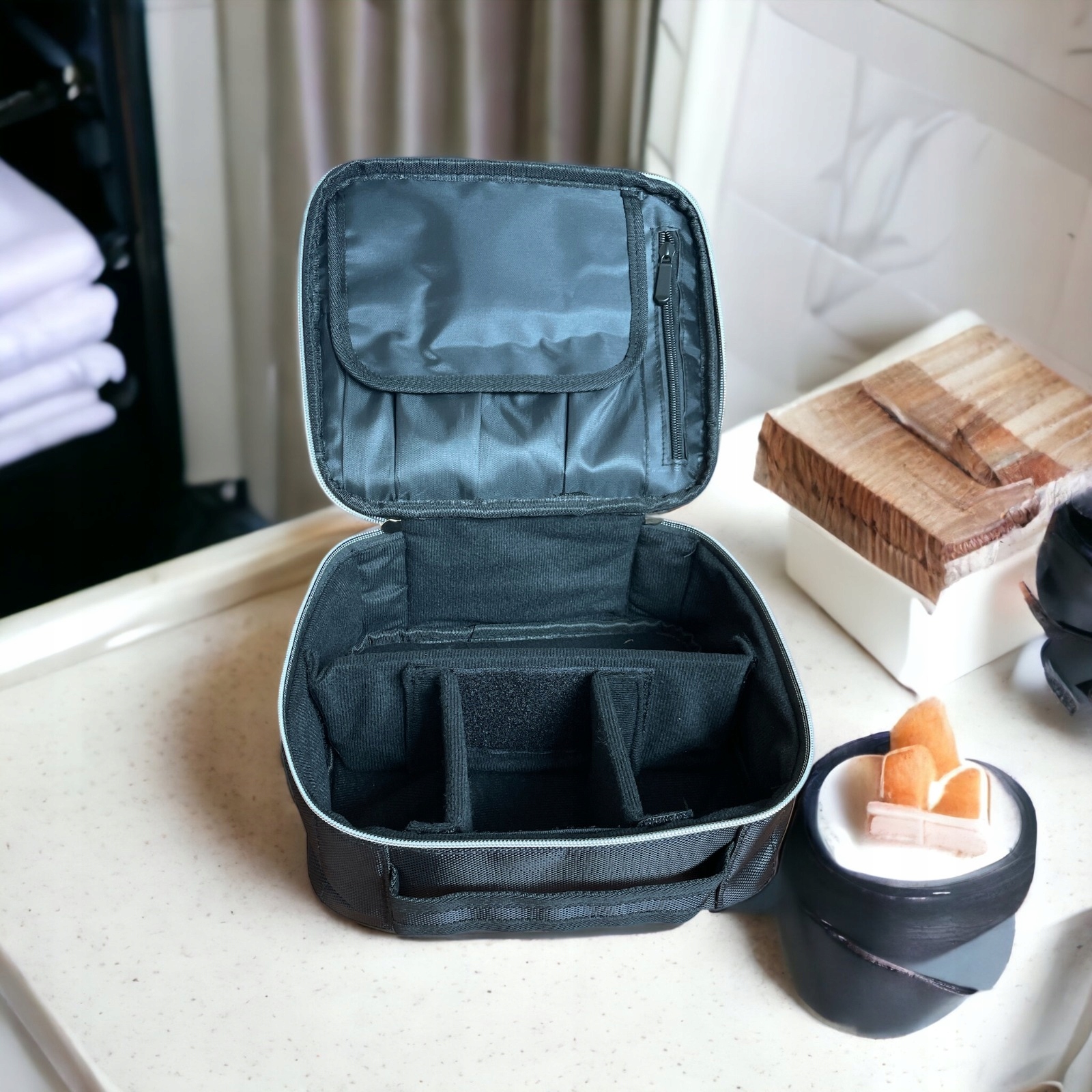 Це забезпечує легкий доступ до косметики. Він незамінний при нанесенні макіяжу або догляду. Ви можете вільно регулювати розміри відділень. Крім того, косметичка має відділення для пензлів і кишеню на блискавці.