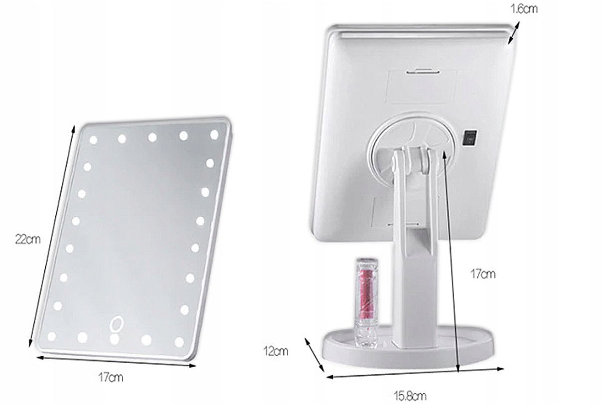 - 22 світлодіоди – дзеркало має аж 22 світлодіоди, розташовані по краях. Таке розташування діодів забезпечує повну видимість кожної частини обличчя, декольте та шиї. Інтенсивність світлодіодного освітлення регулюється за допомогою сенсорної кнопки, розташованої в нижній частині дзеркала.