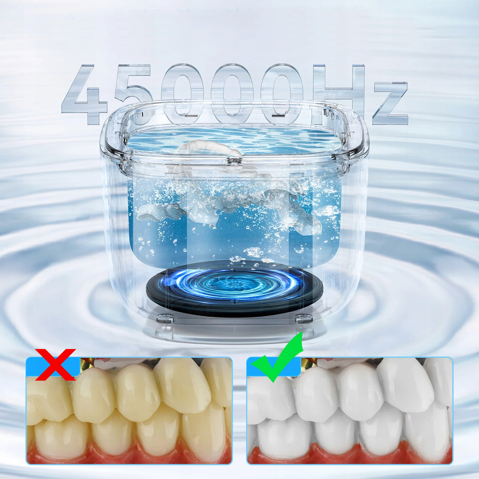 ✅Використовуючи ультразвукові хвилі 42-45 кГц, він може проникати в щілини та отвори в зубах і ефективно видаляти частинки із зубів, фіксаторів, ортодонтичних брекетів, позиціонерів зубів, лотки для відбілювання, капи, насадки для зубних щіток і навіть УФ-промені глибоко очищають.