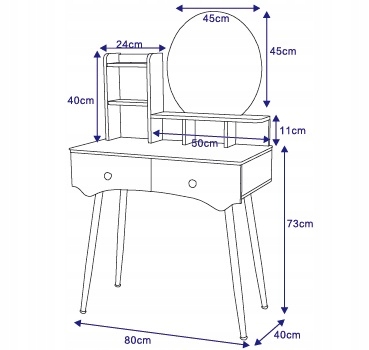 - Розміри продукту: Таблиця макіяжу має розміри 80 см x 75 х 40 см (ширина x висота x gl.). Загальна висота туалетного столика становить близько 135 см