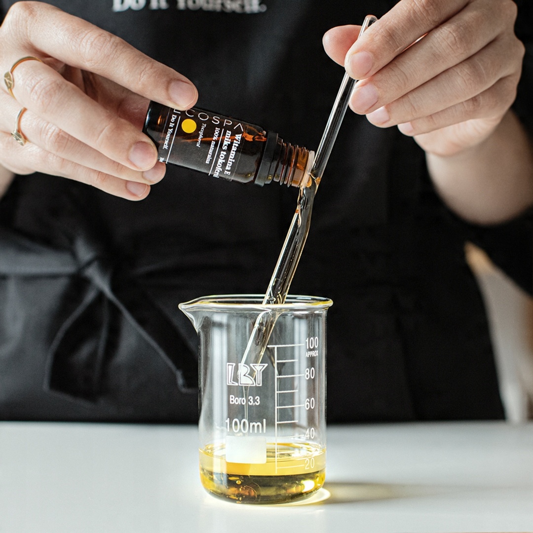 - Вітамін Е ідеально підходить як інгредієнт кремів для обличчя своїми руками (особливо для зрілої, сухої, збезводненої та чутливої шкіри). Ви також можете використовувати його як доповнення до лосьйонів для тіла, зимових кремів для рук, захисних масок для губ або масляних сироваток. Не забувайте додавати вітамін Е в емульсію при температурі нижче 40 градусів С.