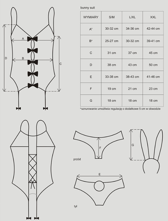 Комплект складається з рожевого еластичного верху з грайливими розрізами, що відкривають тіло, які застібаються витонченими бантами. Зав'язується корсетом, що, з одного боку, дозволяє ідеально сидіти на будь-якій фігурі, а з іншого - стимулює чоловічі почуття. Трусики-трусики з пухнастими хвостиками та корсетні підв’язки з кокетливими бантами додають сексуальності. Еротичний костюм зайчика Playboy доповнений білими панчохами в сіточку і кокетливою пов'язкою з біло-рожевими вушками зайчика. Треба визнати, що така сексуальна білизна втілить найсміливіші еротичні фантазії закоханих, ставши вступом до вдалих постільних ігор.