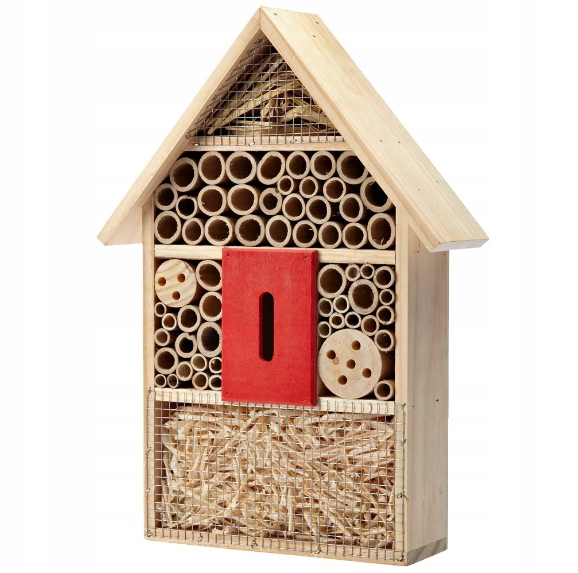 Цей готель для комах, дякуємо використання різноманітних матеріалів і отворів забезпечують легкодоступні схованки для важливих садових комах і павукоподібних, таких як сонечка, метелики, павуки та інші корисні види. Їх присутність в саду дуже важлива, адже багато з них відіграють важливу роль у запиленні рослин і боротьбі зі шкідниками. Збоку готелю є підвісна ручка. Виріб виготовлено з деревини, бамбука та оцинкованої сталі.
