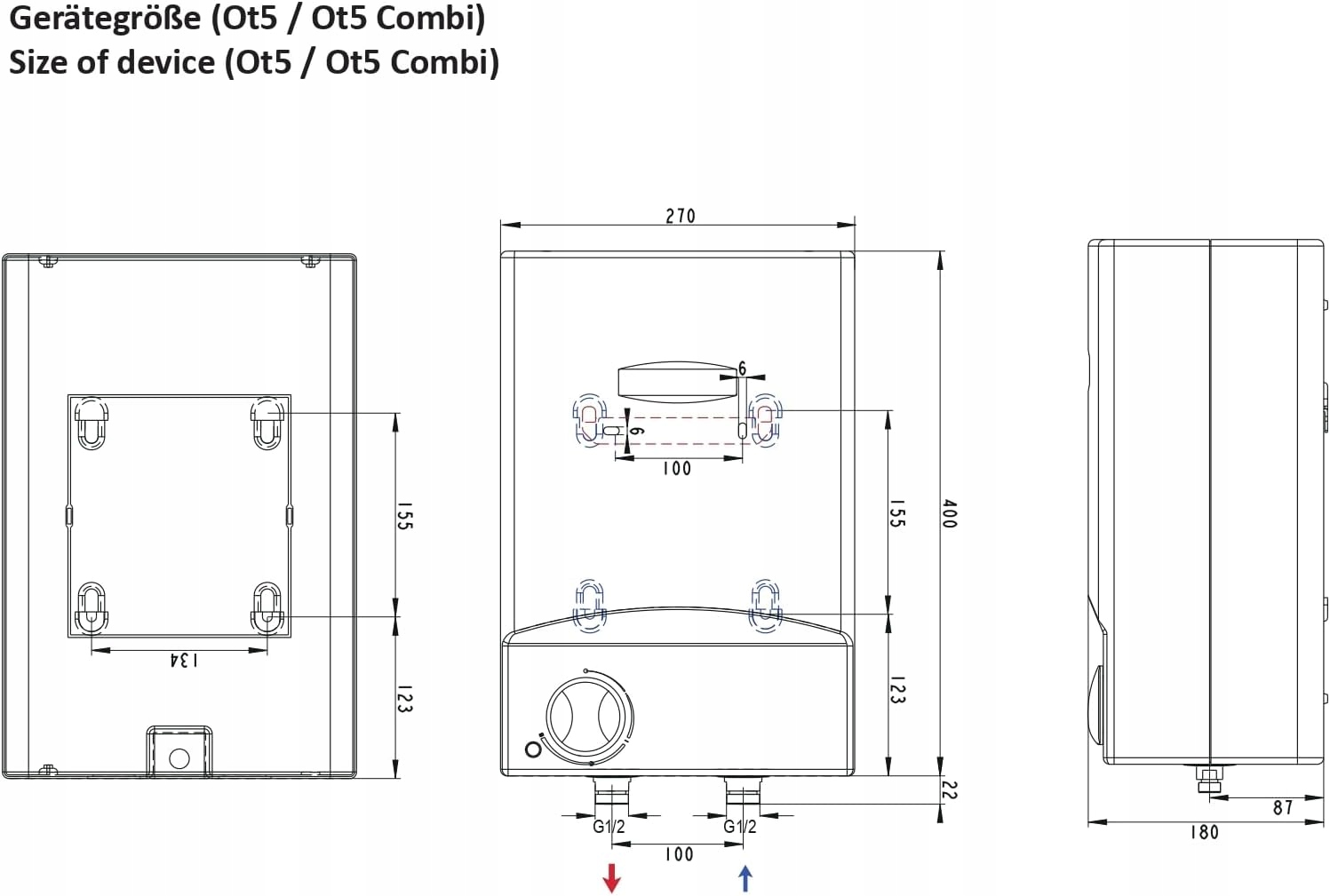 З розмірами 42 (H) x 27 (Ш) x 18 (Г), цей невеликий контейнер об’ємом 5 л можна встановити, заощаджуючи простір. Енергоефективність: завдяки режиму енергозбереження та класу енергоефективності A водогрійний котел OT5 забезпечує ефективне нагрівання води з річним споживанням енергії 490 кВт/год.